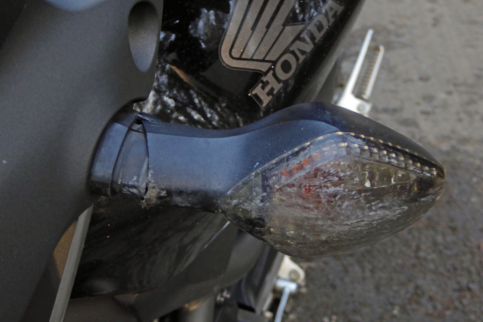 An der NC war die linke vordere Fußraste abgebrochen, der Schalthebel verbogen, der Blinker vorn links eingerissen und nach hinten geklappt, der linke Handprotektor verdreht und zerkratzt, meine zusätzliche Positionslampe verbogen und zerkratzt und der Linke Spiegel verdreht.