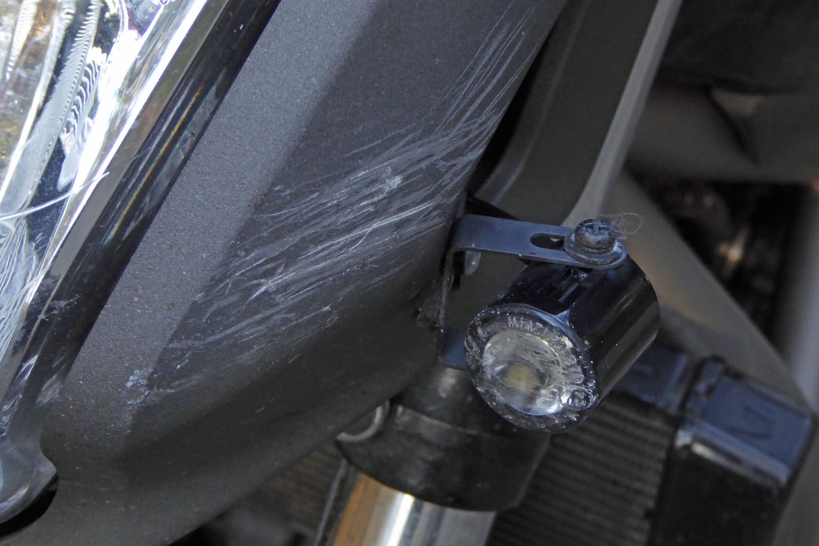 Bis auf mehrere Kratzer im linken Scheinwerfergehäuse war nichts weiter zu sehen, weder an den Seitenverkleidungen, dem Motorgehäuse, der Sitzbank oder den hinteren Griffen.