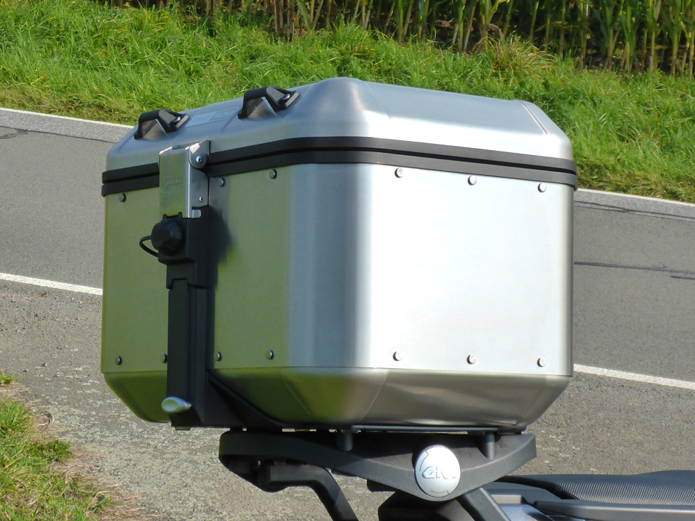 Als Topcase habe ich den Alu-Koffer Givi Trekker Dolomiti 46 im Einsatz.
