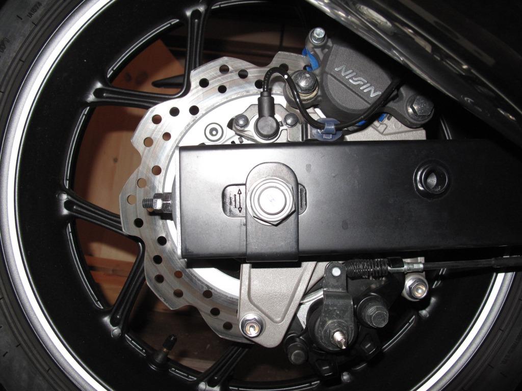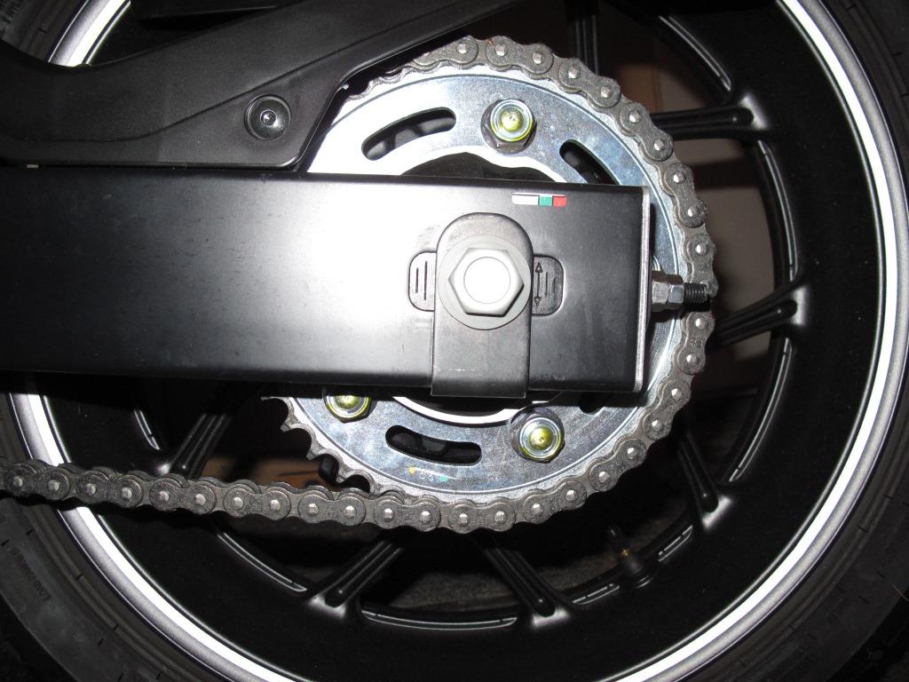 Die Schwingenholme scheinen unterschiedlich lang zu sein (rechts 629 mm und links 627 mm gemessen zur Schwingenachse). Um die Ketten- und Radflucht zufriedenstellend herzustellen mussten die Ketteneinsteller-Indexmarken um ca. 1 Teilung versetzt ausgerichtet werden (siehe Fotos "rechts und links").