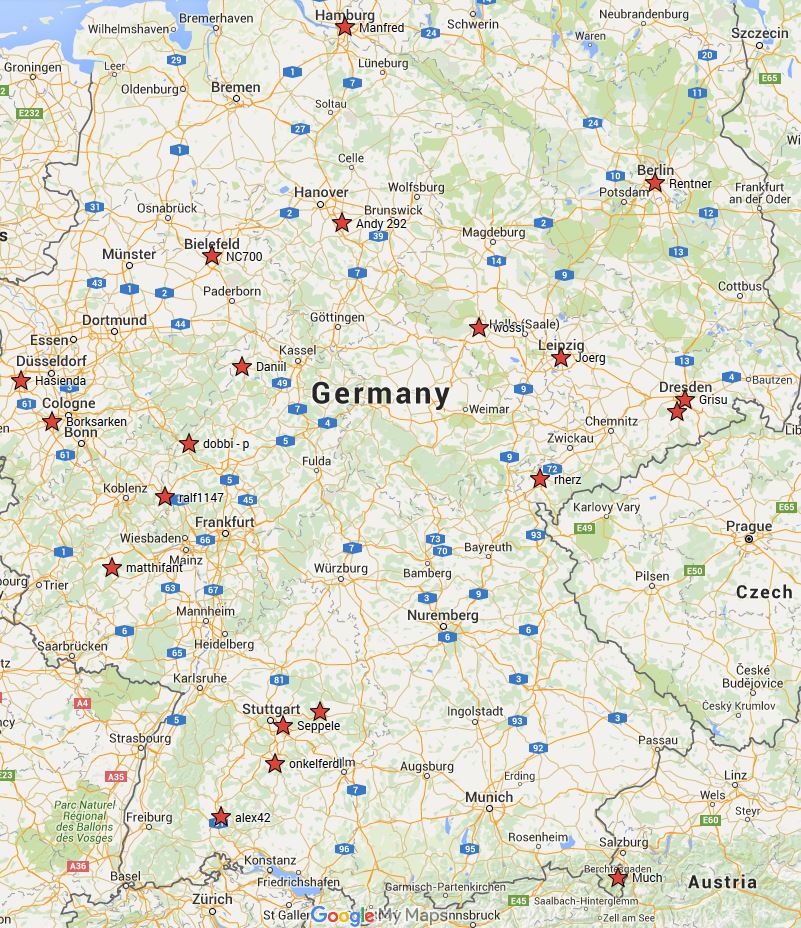 Die Abdeckung im Westen ist schon jetzt kein Problem (ich gehe davon aus dass der Startpunkt bei Heinz in gibt-es-ja-gar-nicht ist), ich könnte dann mal auf 'nen Sprung nach Esslingen kommen, von alex zu Much könnte man sich auf halber Strecke treffen, von Much zu rherz ebenso, dann durch Ossiland über Andy 292 zu Manfred und die Hamburger haben 's ja eh ganz gut mit den Berlinern