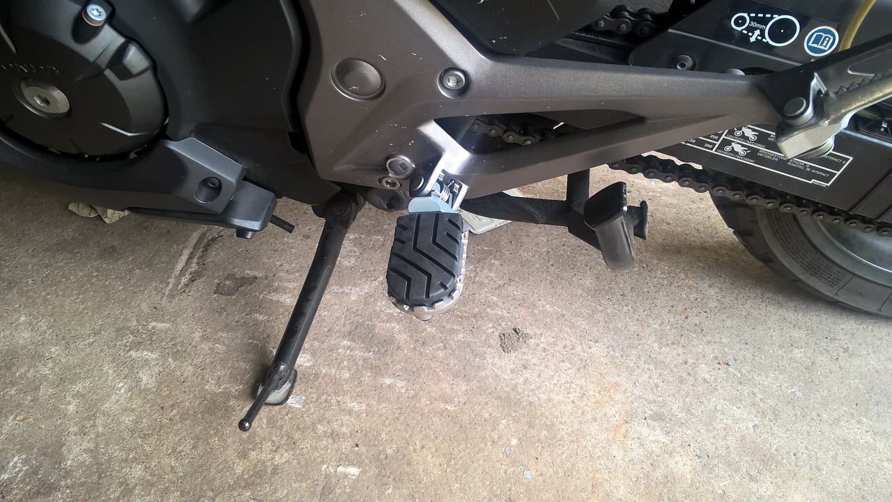 Meine Wahl fiel auf den Rastenkit von SW-Motech. Zum einen sind die Rastenauflagen deutlich breiter, was einen Komfortgewinn verspricht, zum anderen wöllte ich durch die 15 mm Tieferlegung meine linke Kniekehle etwas entlasten, weil da die Unterschenkelprothese etwas drückt. Außerdem besitzen die Rasten eine ABE für die NCs.