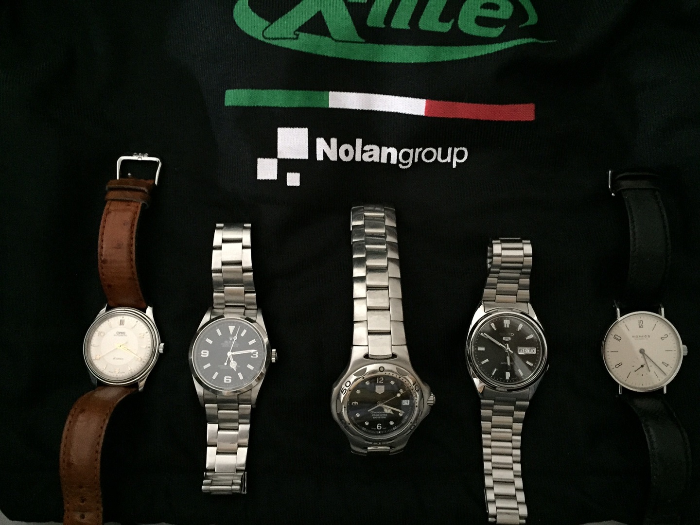 Von links nach rechts: Oris, Rolex Explorer, Tag Heuer Kirium, Seiko, Nomos Tangente.