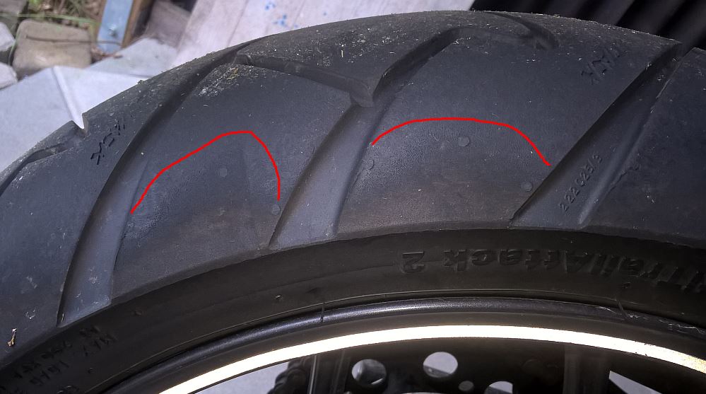 Das wurd in einem Reifenthread mal behandelt, ich meine man kam darauf, dass sich die Lauffläche aufgrund der großen Rillen wölbt. Dadurch kommen die Bögen wohl zustande.