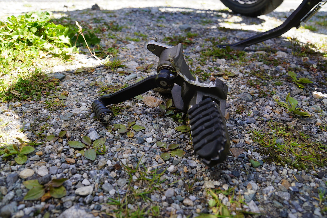 Beim kurzen Gespräch eröffnete er mir dass er am Morgen bereits eine Schrecksekunde erlebt hat da ihm die Maschine in einer Kurve umgekippt war. Folge davon war ein defektes Blinkerglas und ein vebogener Schalthebel.