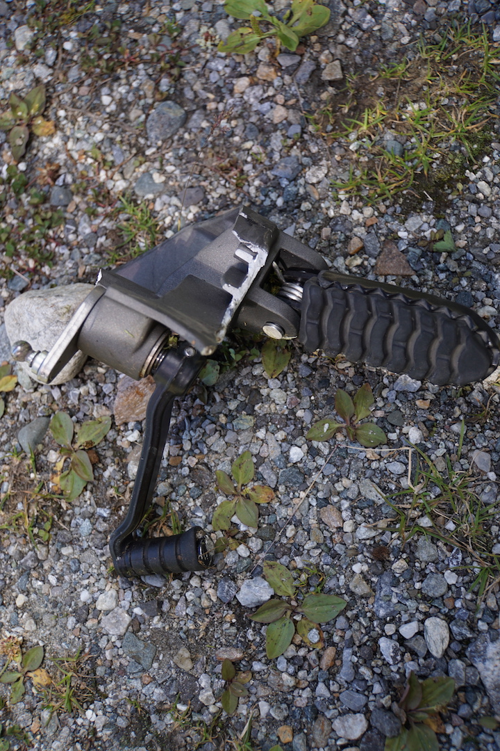 Wie schon geschrieben hat der Ganghebel aufgesetzt und die Maschine ist deswegen von der Strasse gerutscht. Irgendwann während des Rutschen ist dann der Schalthebel, die Fussraste oder gar das Gussteil an irgendwas hängen geblieben und so wurde das Gussteil abgerissen….
