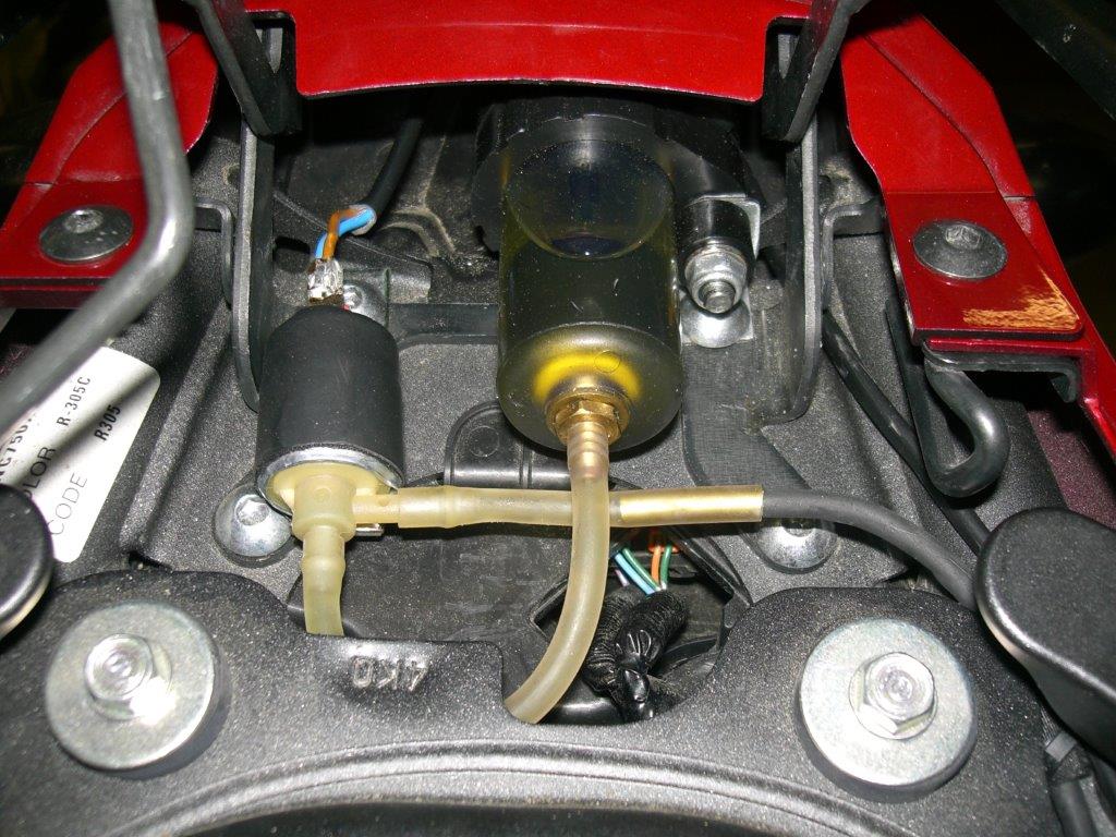 Der Scottoiler wurde zuerst zerlegt und die Hubstange mit dem Endanschlag mittels einer M2,5 Schraube fest verbunden. Der Öler kann jetzt noch wie original verstellt werden schließt aber nicht mehr. Montiert wurde er im Heck des Motorrads und kann gerade noch so mit dem Mittelfinger verstellt werden. Zum befüllen wird einfach die hintere obere Verkleidung mit zwei Schrauben entfernt.