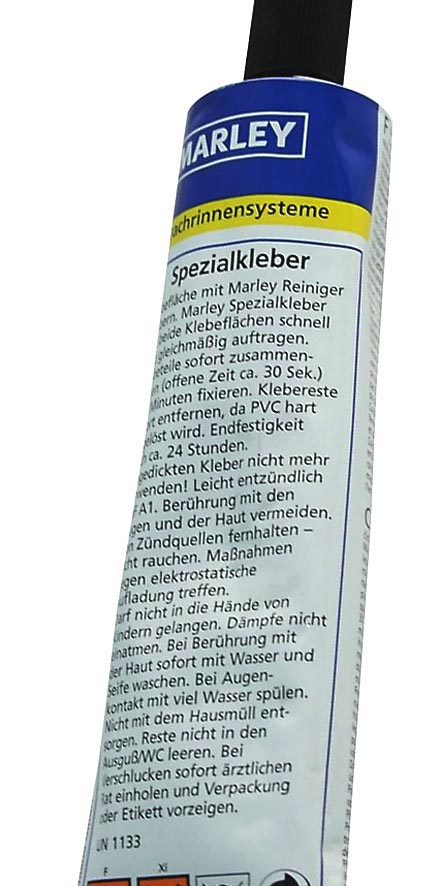 Der empfohlene Kleber ist PVC-Kleber und ganz sicherlich für PVC-Dachrinnen und Teichfolie hervorragend geeignet (s. Foto)
