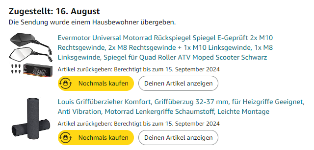 Ich habe mir den rechten Rückspiegel und einen Griffüberzieher kaputt gefahren.