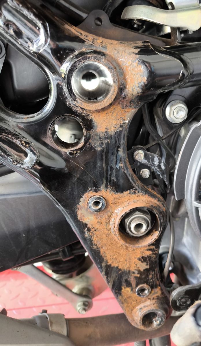Der Rost hatte den Lack unterblüht. Die Maschine ist gerde 6 Jahre alt. Kein Winterbetrieb und Schlechtwetter versuche ich zu vermeiden. Ist auch kein Steinschlagbereich. Alles hinter der Verkleidung versteckt.