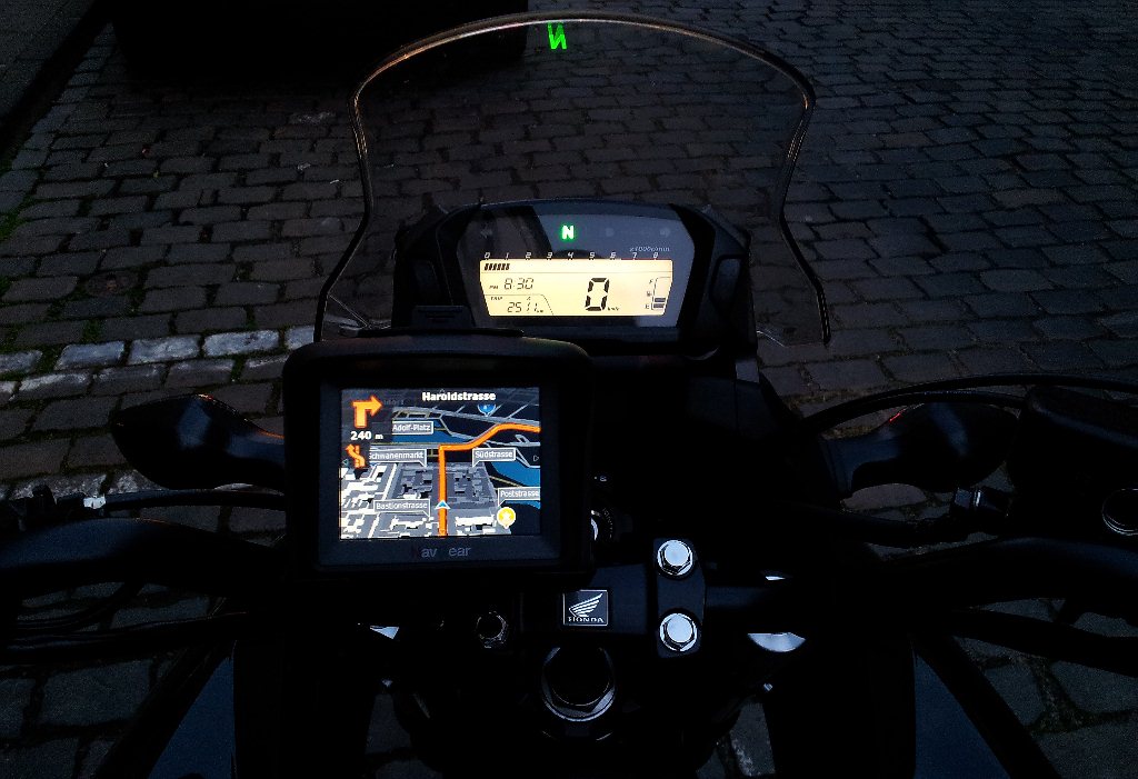 Das Display ist ok aber nix besonderes, richtig grellen Himmel oder gar Sonneneinstrahlung direkt drauf verzeiht es nicht - man sieht rein gar nichts mehr, da eine reflektive Schicht fehlt. Aber fuer den Alltagsgebrauch durchaus ok, auch im Dunkeln angenehm abzulesen. Gegenueber besseren Produkten wie dem TT Rider oder Garmin ist hier allerdings bis auf die grossen Symbole fuer Motorradfinger nichts weiter aufs Motorradfahren abgestimmt. Das Ganze ist wirklich am ehesten eine Start-Ziel Navigation, weder besondere Gimmicks bei der Routenfuehrung noch ein Routenimport scheinen integriert zu sein. Nur das uebliche "Faehren, Maut, Autobahnen J/N", "Schnell/Kurz/Sparsam" Gedoens wie immer.