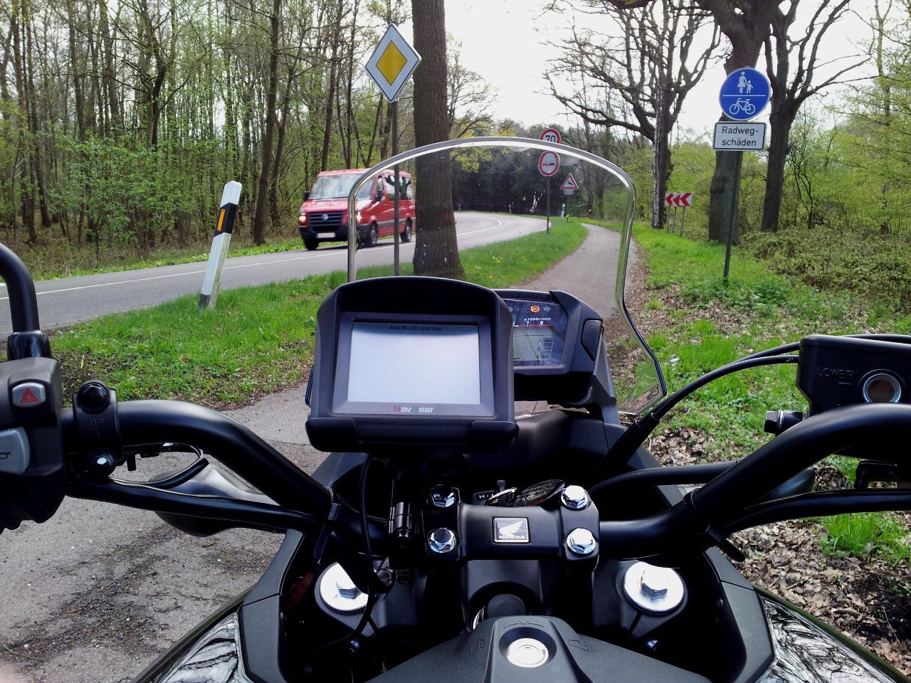 Mit dem Navi kommt ein Bluetooth Headset (mono, 1 Ohrpad), dass aussen an den Helm geklammert werden soll. Das geht bei meinem Klapphelm nicht, es gibt keine passende Stelle zum dranclipsen. Sicher koennte ich es irgendwie an den Helm bekommen, aber mir ist es im Prinzip egal, da ich eh nur nach den visuellen Kurzanweisungen fahre (Pfeile und Entfernung zur naechsten Aktion). Aber schonmal etwas zum Beachten.
