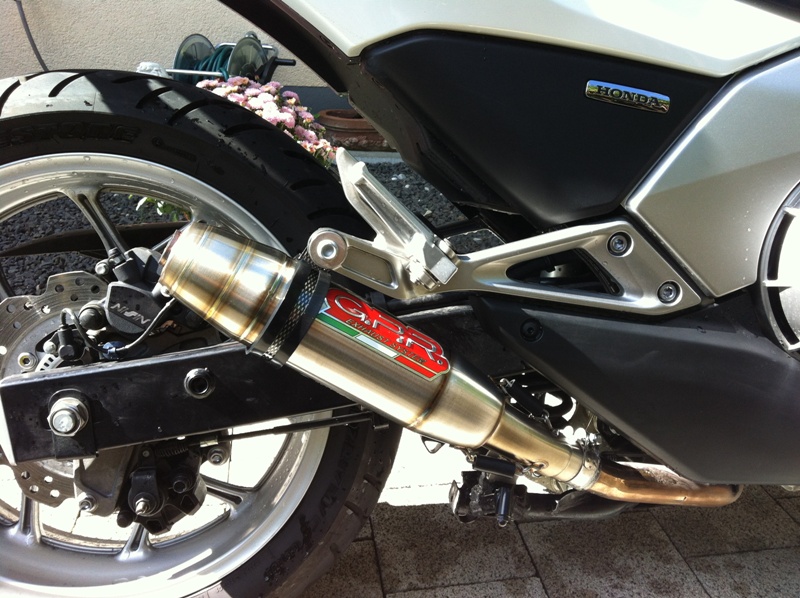 Der Klang ist dumpf und für ne 700'er erstaunlich satt, nicht so blechern wie z.B. der Leo Vince. Und kein Vergleich zum Akrapovic, der fast wie die Serientüte klingt.