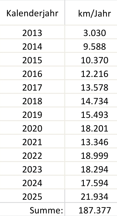 Jedoch unabhängig von Nässe so zwischen 10 und 20 mal im Jahr, also alle 1.000 - 2.000 km.