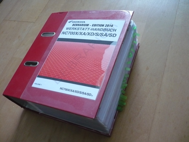 Zwischenzeitlich sind ja eine Menge neue Mitglieder im Forum. Deshalb hier noch einmal in Kurzform:Das Bebrarium ist ein Werkstatt-Handbuch. NC700X/XA/XD/S/SA/SD. Es wurde von unserem lieben Heinz (NC700) mit großem Zeitaufwand liebevoll erstellt. Alle einzelne Seiten stecken in Klarsichtfolie. Außerdem ist es Komplett auf einem beigefügten USB-Stick, zum herunterladen, abgespeichert.