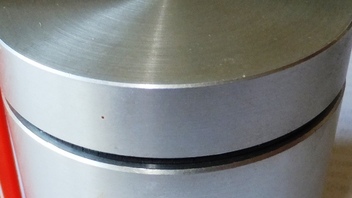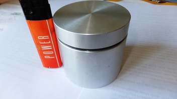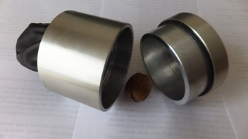 Man nimmt den Deckel vom Zylinder, legt eine Nuß in den schwarzen Gummibeutel,