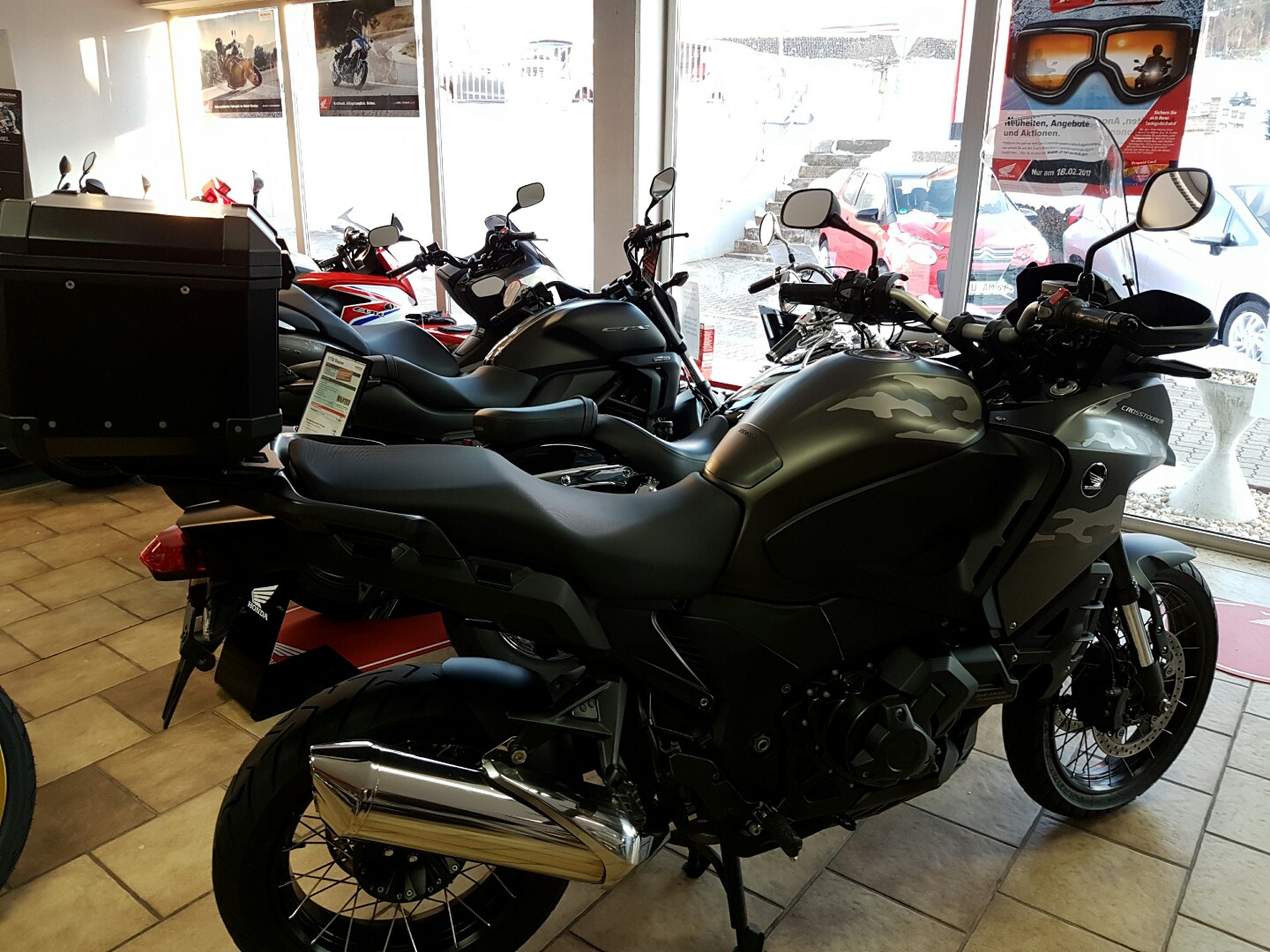 Heute wollten wir mal so ein bißchen bummeln. Möbel Brucker hatte verkaufsoffenen Sonntag. Die Marktschreier waren nicht das was ich vom Hamburger Hafen kannte, naza War aber auch ganz nett. Zufällig war ein FHH gerade mal 300m weiter. Also kurz mal vorbei und durch die Scheibe geschaut, was da denn so steht. Plötzlich geht die Tür auf und man sagt mir, dass ich auch herein kommen könnte. Also nicht lange gewartet und mir die schönen Teile von ganz nah angeschaut. Und was soll ich sagen, da stand sie und bat mich sie mitzunehmen. Ich also schon als Kind gelernt, dass man nicht unhöflich sein soll, habe den FHH gebeten, ihre Fesseln zu lösen. Nun ist sie mein. Nun, wer ist sie, werdet ihr euch jetzt fragen. Sie ist eine VFR1200XD in Carmouflage mit schwarzen Koffern. Ich werde sie alsbald abholen, damit sie ihr neues Zuhause kennenlernen kann. Ich glaube, wir beide sind schon sehr aufgeregt, also ich bin es auf jeden Fall.