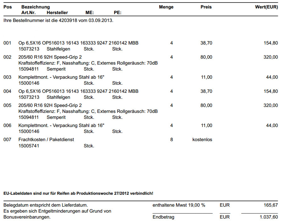 Im Anhang die Rechnung unserer W-Reifen. Den Komplettpreis geteilt durch 2.Viele Grüße, Alex