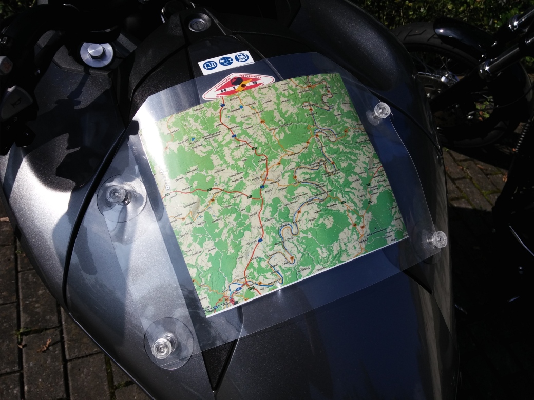 Habe mir Saugnäpfe mit V2A Gewinde besorgt. Dann eine beliebige Karte ausgedruckt. Diese dann eingeschweißt bzw. laminiert. Dann einfach die Saugnäpfe befestigt. Karte drüber, die 4 Löcher abgezeichnet und eingestochen. Ränder beschnitten und dann Karte festgeschraubt. Kann man noch optimieren. Man kann ja auch auf der Rückseite eine weitere Karte drucken. Die Saugnäpfe Idealerweise mit Haarspray befestigen, oder mit Silikonspray. Bisher hält es sehr gut. Auch auf Autobahnfahrten.