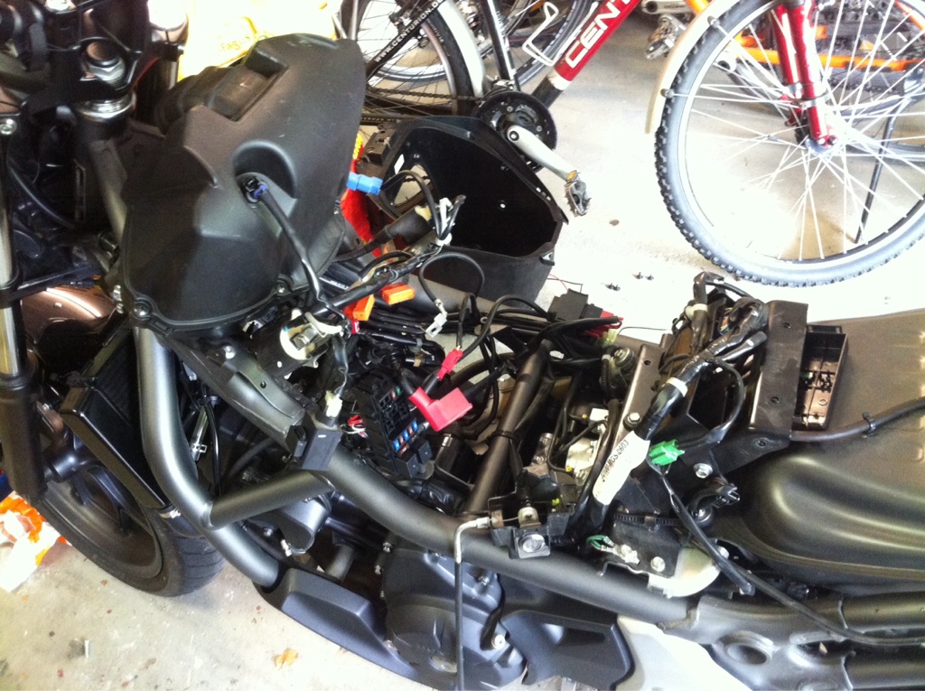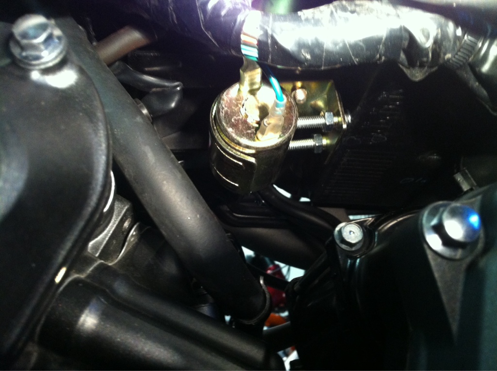 mmh.. wäre ziemlich eng geworden mit der Verkleidung, jetzt ist der Motor unter der Batterie angeschraubt (sichtbar wenn man in den Benzinmotor reinguckt). Der Taster ist OHNE Beleuchtung (Link folgt) und sitzt vorne im Mittelteil (direkt vor der Ansaugung). Das Relais ist an die Halterung des Blinkrelais angeschraubt.