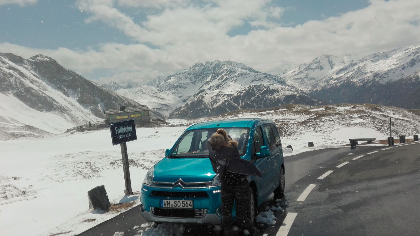 Die Hoffnung, noch etwas zu sehen zu bekommen schwand inzwischen auch bei mir, als die Wolken kurz hinter'm Fuscher Törl plötzlich aufrissen und herrlichstes Bergpanorama freigaben. So angefixt konnte ich nach dem obligatorischen Stop am Gletscher bei minus 4 Grad die Kids davon überzeugen, dass wir jetzt auf keinen Fall mehr Richtung Norden / Blizzard zurückfahren, nein, nein, sondern uns nach Süden weiter Richtung schönem Wetter halten sollten.