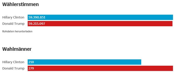 De facto hat Clinton 50,1 % der Stimmen erhalten und Trump 49,9 % - ziemlich exakt wie von den Wahlforschern vorhergesagt.