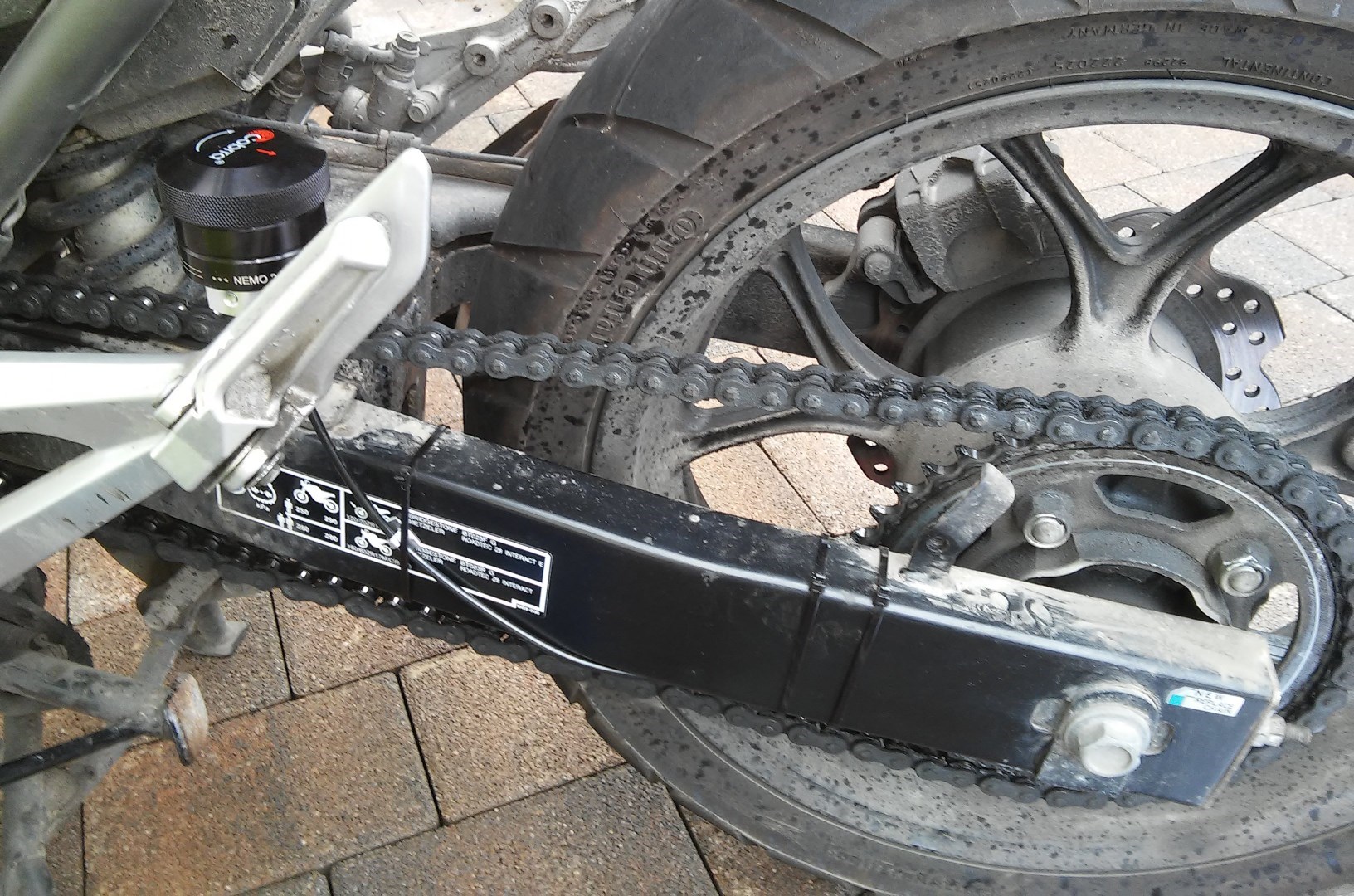 Was soll ich sagen? Ich bin begeistert. Die Aufnahme am Motorrad ist M8, Der Nemo ist nur auf 6 mm gebohrt. Aufbohren des Nemos ist selbst mit dem Akkuschrauber und Stahlbohrer kein Problem, das sollte jeder hinbekommen. Anschließend mit 4 Unterlegscheiben als Distanzstück (sonst hat der Behälter des Nemos Kontakt) direkt ans Motorrad verschraubt, lächerliche 40cm Schlauch an der Schwinge entlang verlegt (nur eine Zwischenbefestigung per Kabelbinder, und selbst die hätte man sich sparen können), und fertig! Der größte Aufwand war es noch danach die Kette und das Kettenrad zu putzen, damit das Öl überhaupt an die Kette rankommt. Vor allem die Reinigung des Kettenrades war nötig, da sonst beim Rückwärtsschieben der Schlauch am Dreck hängen blieb.