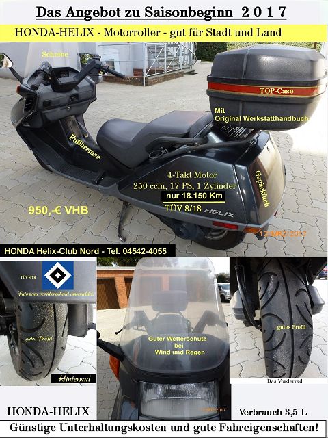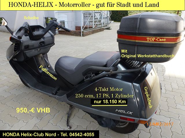 möchte alle Möglichkeiten nutzen, einen Oldie und inzwischen zum Kultroller gewordenen HONDA HELIX wieder auf die Straße zu bringen. Vorbesitzer ist gerade verstorben; bin nur als Vermittler tätig.