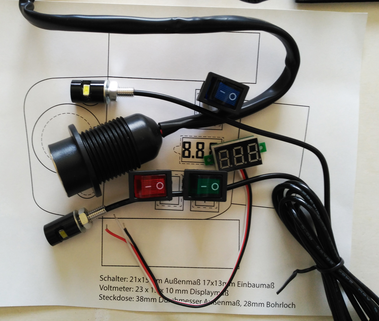 Ich habe aus einer schwarzen Acrylplatte eine kleine, hinten offene Box gesägt, gebogen und geschmort, in die ich die Steckdose (von Luise), ein Voltmeter, eine Kennzeichenbeleuchtung und 3 Schalter (alles von der Bucht, gibt´s aber auch beim entsprechenden Fachhandel) eingebaut habe. Entsprechend verkabelt (wobei ich die Beleuchtung der Schalter einfach nicht angeschlossen habe, da diese sonst unnötig Strom zieht. Hab´s gemessen und für unnötig befunden.)