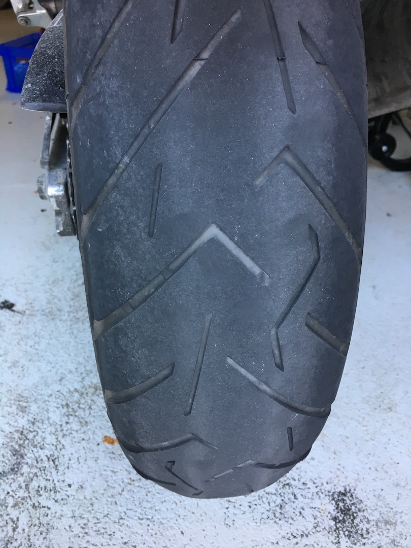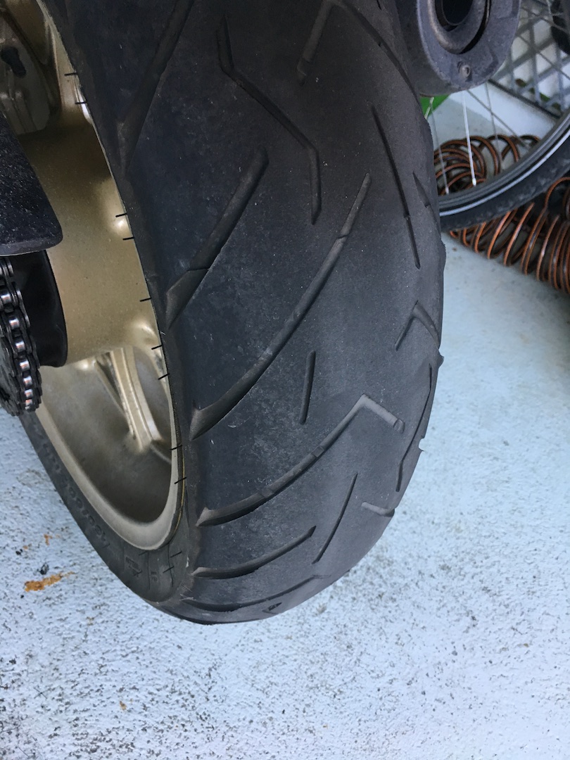 Fahrprofil: von den letzten 6000km waren 4000km Urlaubstour mit Ehesozia und viel Gepäck (Zuladung geschätzt 230-240kg), Schweiz, Südtirol, Ungarn, Kroatien und zurück, da waren also sowohl Alpen, Dolomiten, Pässe dabei, als auch lange, gerade Strecken im flachen Ungarn. Keine Autobahn. Die restlichen 2000km sind Schwarzwald und Arbeits(um)weg, eher solo.Vom Fahrverhalten bin ich bis zum Schluss begeistert: Haftung, Lenkverhalten absolute spitze. Und auch die Abnutzung ist relativ gleichmässig, allerdings im mittleren Bereich etwas grösser. Ist also denk ich definitiv kein Reifen für lange Geradeausfahrten oder Autobahnen.