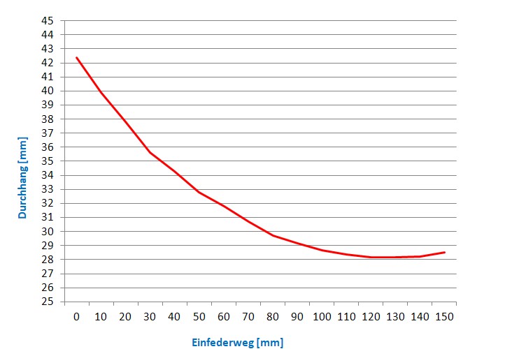 Die absoluten Werte für den Durchhang sind hier nicht wichtig - sie hängen vom während des Experimentierens zufällig eingestellten Kettendurchhang ab. Wichtig ist die Charakteristik, die erkennen lässt, bei welchem Einfederweg die meiste Kettenlänge benötigt wird und wo der Umkehrpunkt ist. Interessanterweise ist der Umkehrpunkt genau da, wo der Federweg des Hinterrads endet - beim Forza bei 120mm.