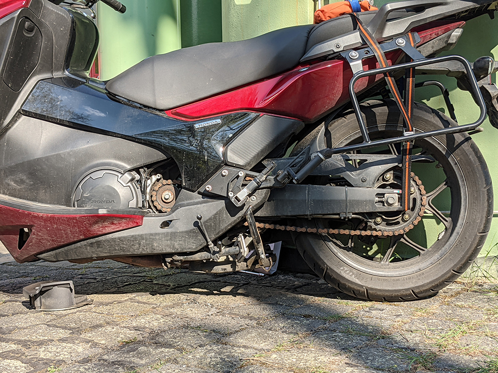 Die Kettengleiter, die den Verlauf der Kette zusätzlich beeinflussen, muss ich vorerst ignorieren, weil beim Forza, ohne die Verkleidung demontiert zu haben, die Kette und ihr Verlauf nur innerhalb kleiner Abschnitte zu beobachten ist.
