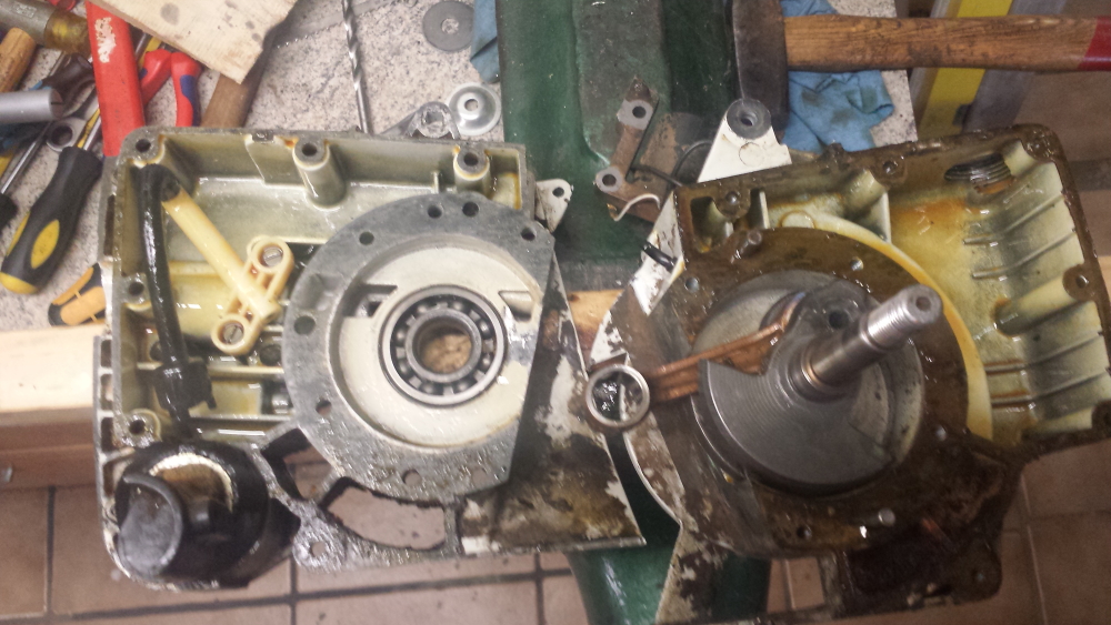 Die Säge ziemlich alt, "Made in West Germany". Also zumindest 25 Jahre alt...Bestandsaufnahme: Starterseil gerissen, Kolbenfresser bedingt durch Späne vom unteren defekten Pleuellager.