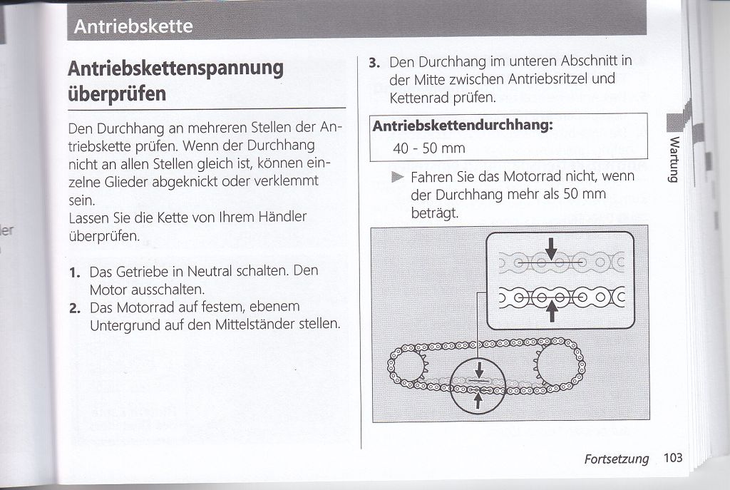 Hallo, wollte heute mal die Kettenspannung überprüfen. Laut Fahrehandbuch: Antriebskettendurchhang 40-50mm.