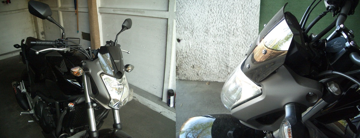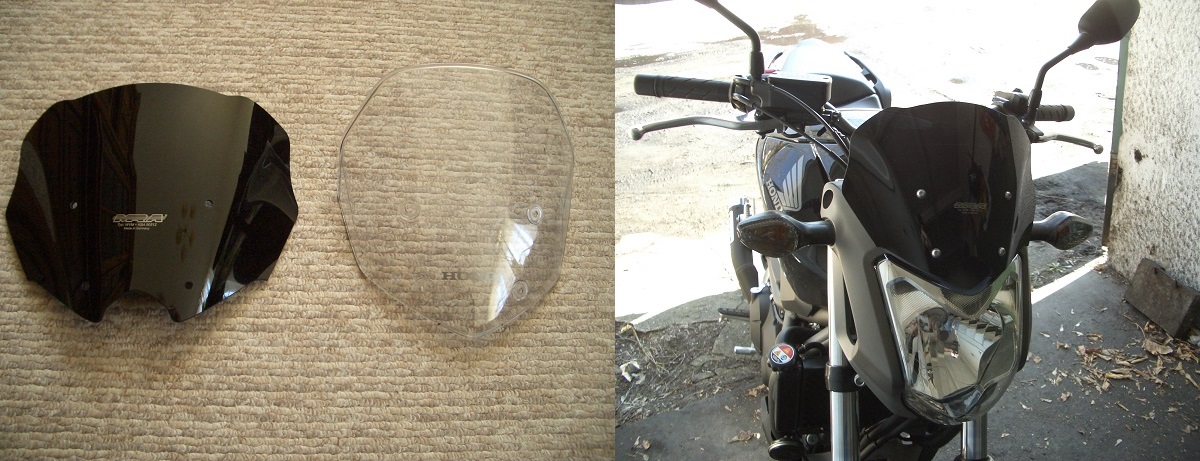 Weil ich eigentlich keine Scheibe am Motorrad mag und auch keine brauche, da ich 95% nur in der Stadt fahre, war ich schon lange auf der Suche nach einer kleineren/kürzeren Scheibe. Habe dann endlich die MRA Sportscheibe für die NC700S gefunden. Hier mal im Vergleich zur Originalscheibe: