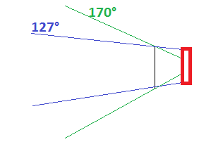 Zur Frage bezüglich Weitwinkel habe ich mal ein ultra primitives Schema aufgemalt. Siehe Bild. Das rote rechts stellt den Lichtempfindlichen CMOS-Sensor dar, der in maximal 1080 HD Auflösung aufnehmen kann. Die blauen Linien deuten (primitiv) den schmaleren Weitwinkel an. Dafür nimmt der Sensor aber mehr Licht auf und kann ein größeres Bild abspeichern.1080 (Full HD -1920x1080 bei 16:9) -> 127 Grad. Wenn du umschaltest auf großen Weitwinkel, wird die Lichtprojektion auf den Sensor kleiner, und somit die Auflösung weniger. 720 (HD Ready -1280x720 bei 16:9) -> 170 Grad.