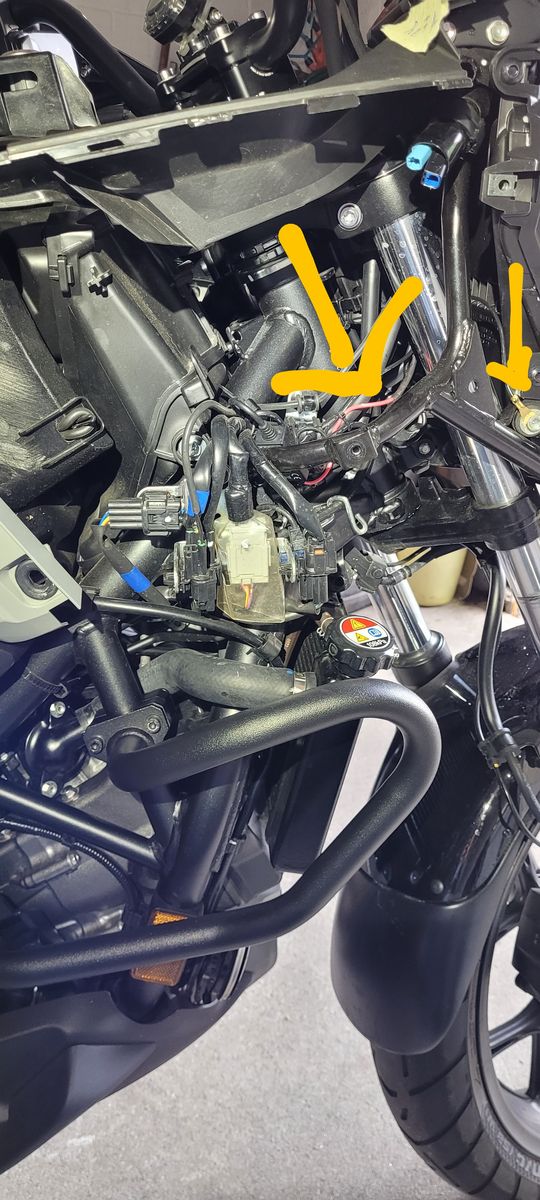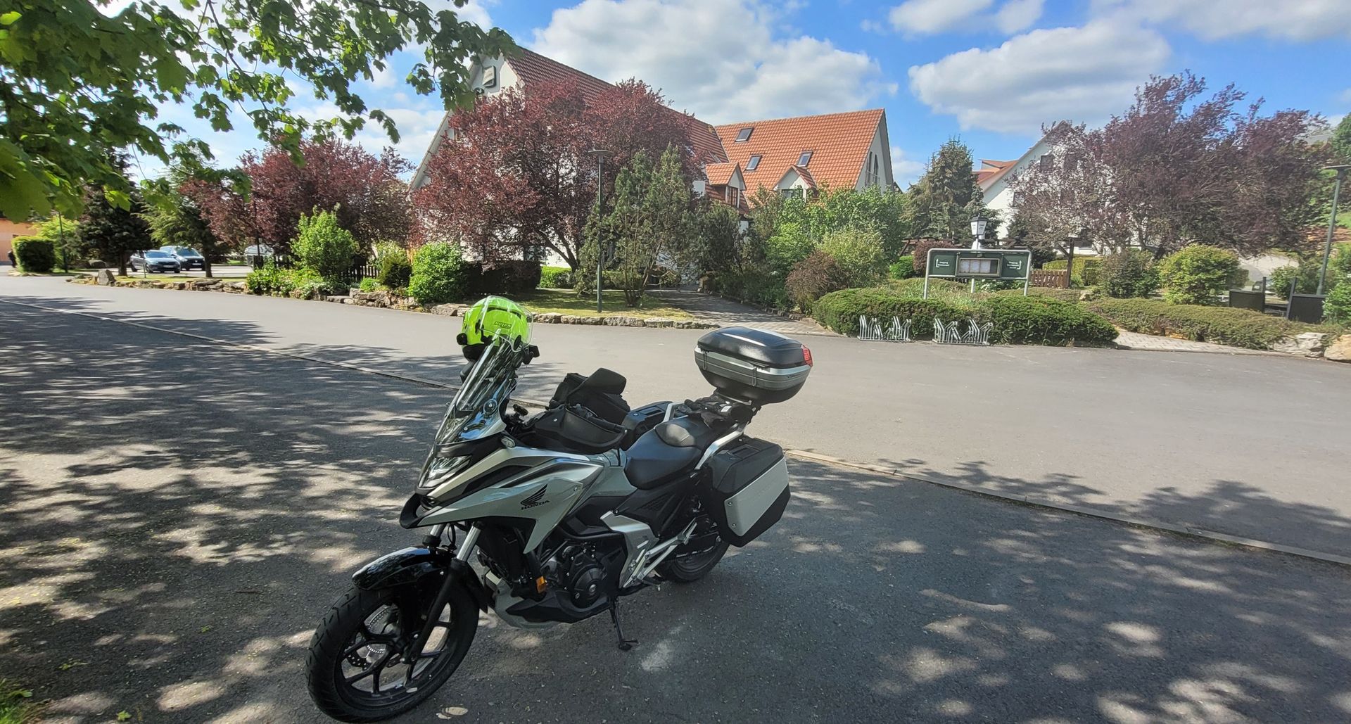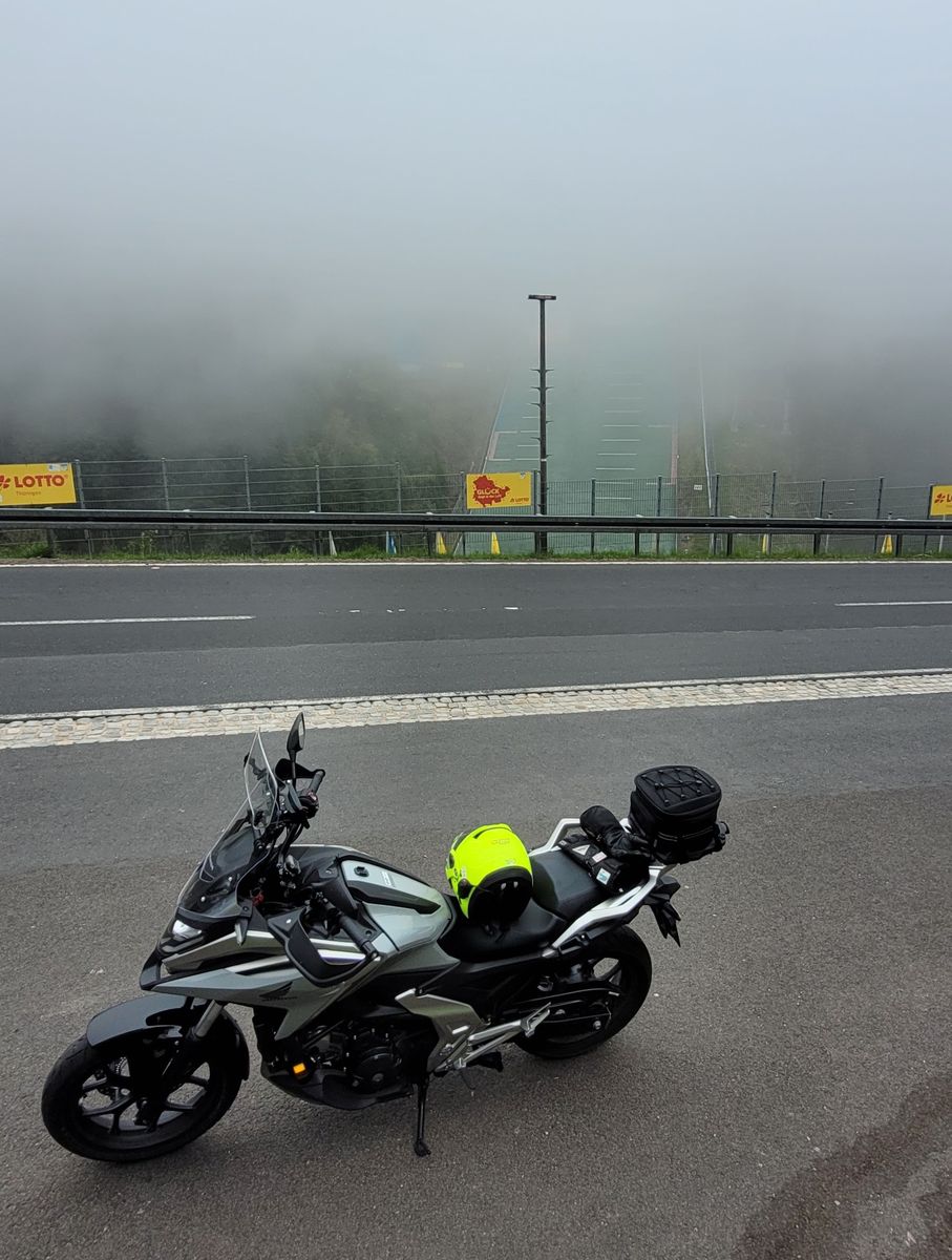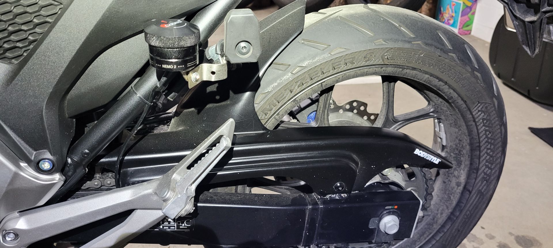 Anbei ein Bild meiner Lösung. Im Fahren komme ich nicht dran. Aber im Stand (z.B. rote Ampel, im Stau usw) komme ich ohne Probleme an den Kettenöler. Oberkörper etwas nach links drehen und schon passt es. Da ich aber eh nach jedem Tanken eine 1/4 Umdrehung weiterdrehe, ist das sowieso kein Problem.