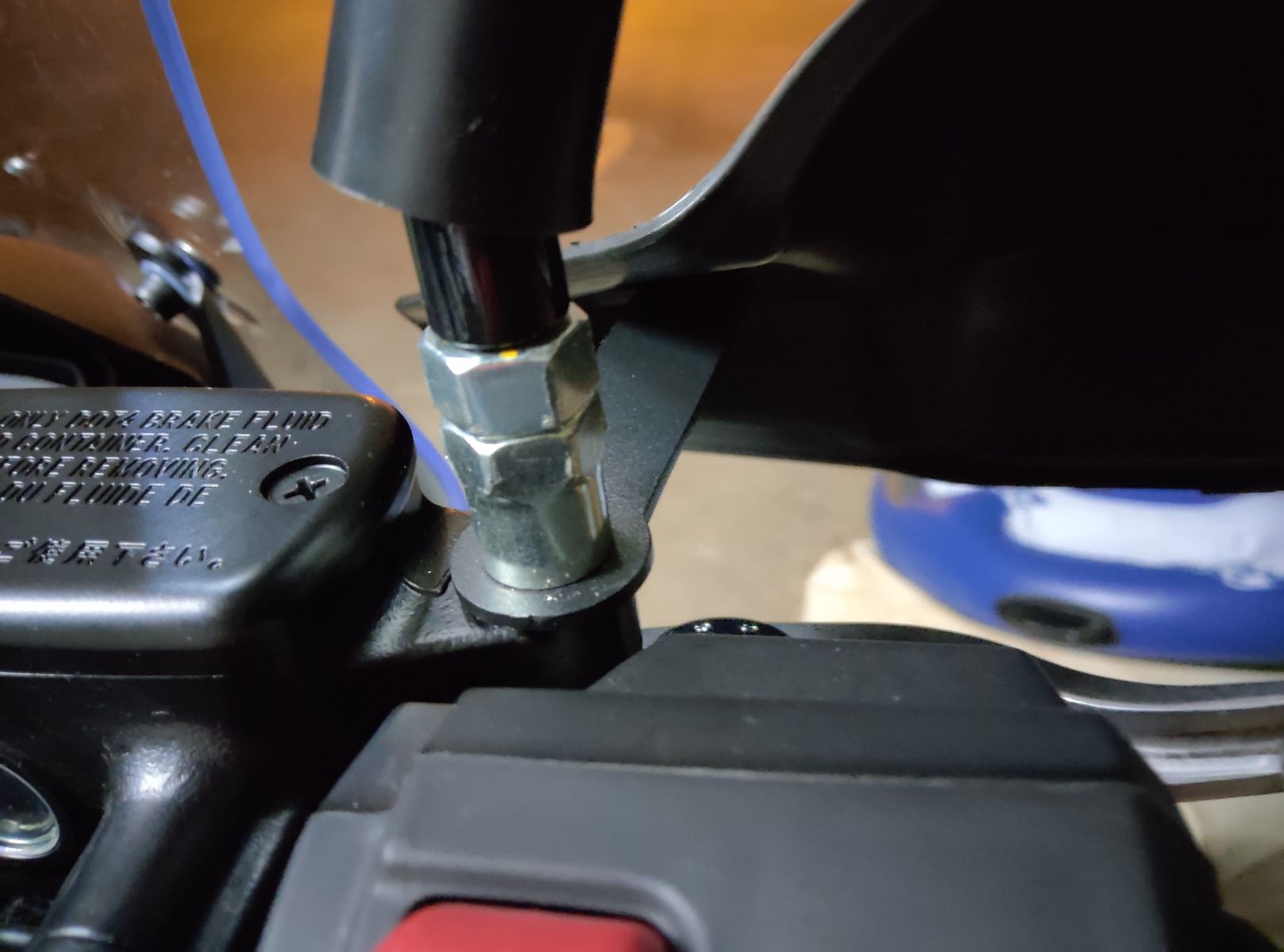 Aber zuerst hatte ich bei der Montage einen kleinen Fehler gemacht. Die Verbindungslasche hatte ich zwischen Kontermutter des Spiegels und dem unteren Gewinde Bolzen befestigt. Sah irgendwie blöd aus, da die Gummimanschette nun nur über die Kontermutter ging und der untere Gewindebolzen "nackig" war.