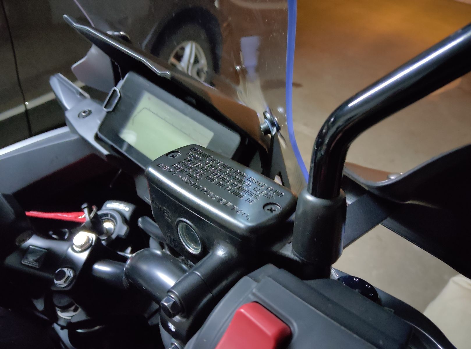 Also nochmal demontiert und die Verbindungslasche der Handprotektoren unter dem unteren Gewinde Bolzen befestigt. Nun geht die Gummilasche über die Kontermutter des Spiegels und dem unteren Gewindebolzen. Siehe Fotos.