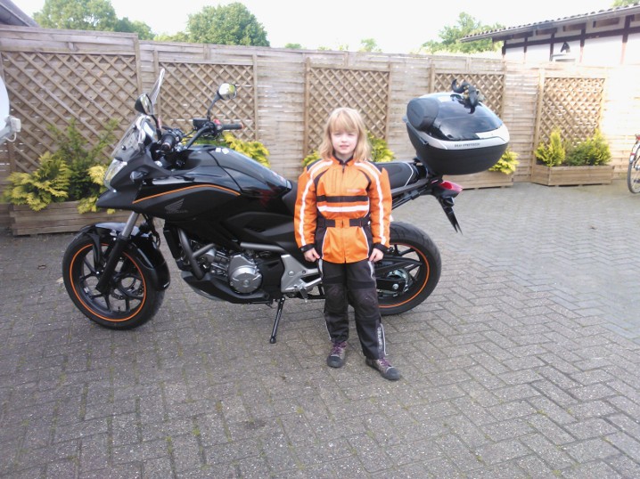 Zum festhalten nimmt sie lieber die Haltgriffe am Motorrad als den Haltegürtel an der Jacke und das sie mir nicht vom Bock fällt beim beschleunigen fahren wir immer MIT TOPCASE mit Rückenpolster.Wichtig ist auch eine Gegensprechanlage so können wir uns austauschen bei der Fahrt.Auch immer wieder die erstaunten Blicke der anderen Biker wenn so ein kleines Dötzchen stolz absteigt und der Kommentar kommt "das hättet ihr nicht gedacht,Mädchenpower" O-Ton von ihr
