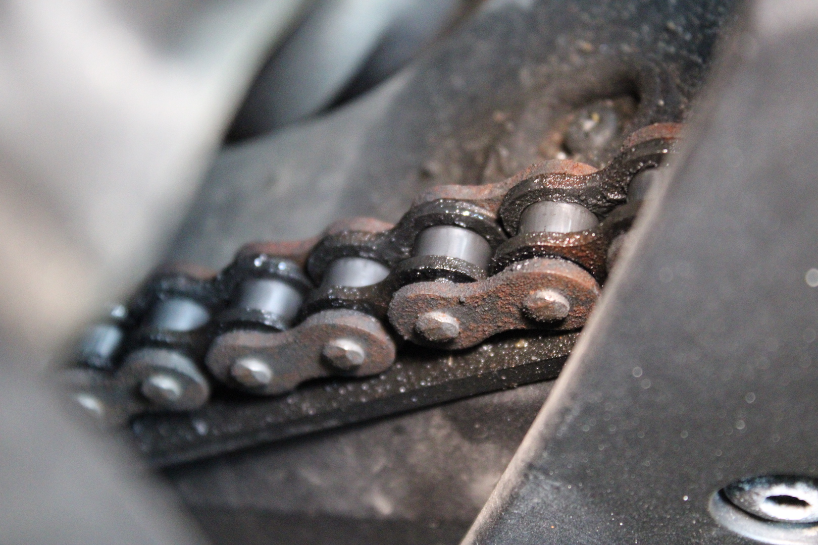 Hier mal ein aktuelles Foto, Kette innen gut geschmiert, aussen trocken. Alle Gelenke haben genau die richtige Menge Öl. Der Rest des Fahrzeugs bleibt ohne Kettenöl.