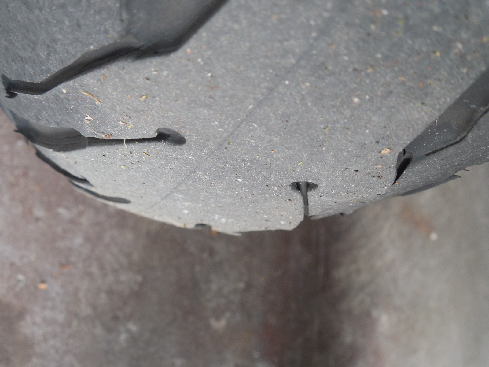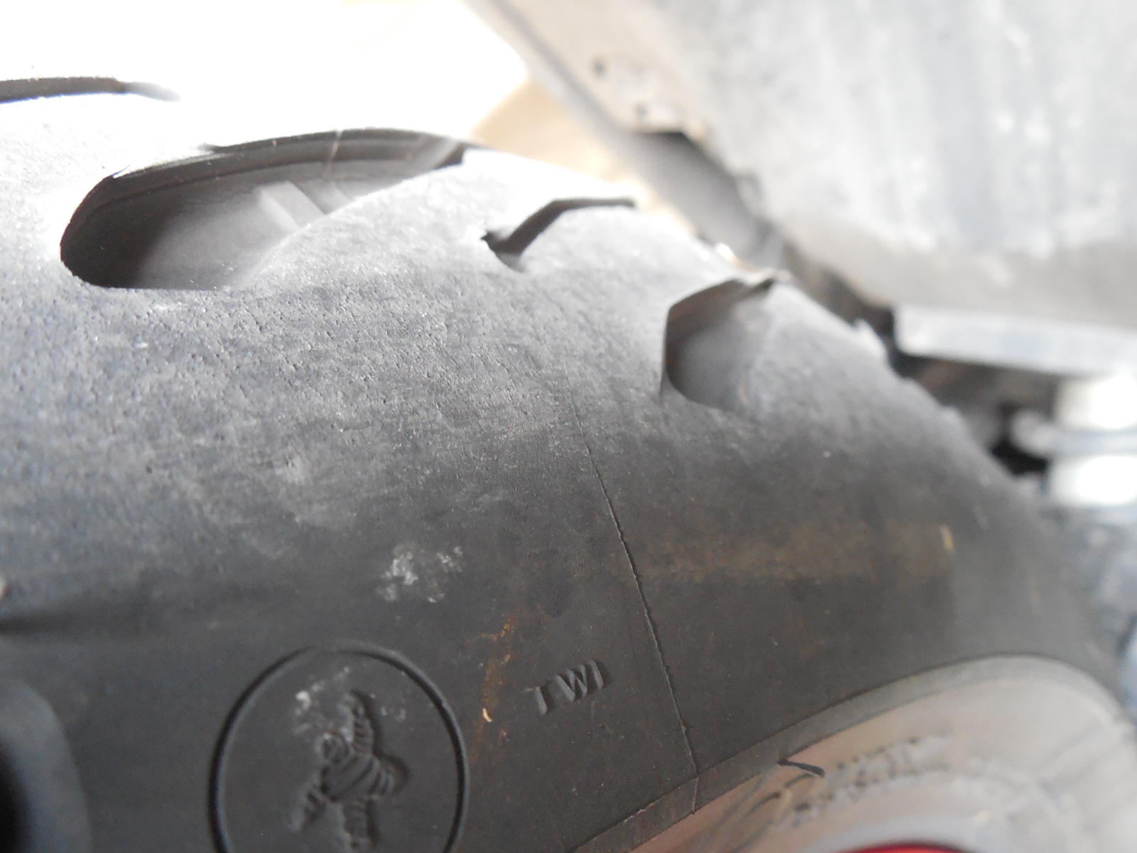 der hinterradreifen meiner nc750s, ein michelin road 5, sieht nach 7' km ziemlich verwüstet aus: sägezahn und gummifähnchen, die sich langsam ablösen.