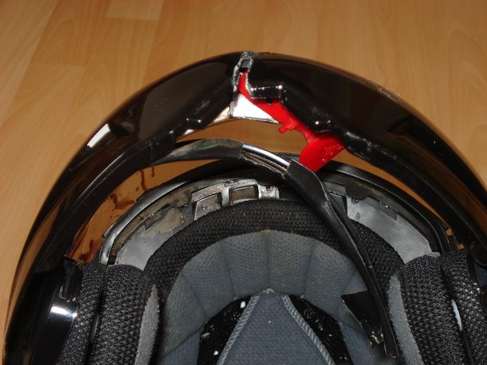 Auf den Bildern unten könnt ihr meinen Helm von meiner ersten Unfall sehen. Ich bin damals mit einer Simson S51 auf der Hauptstraße unterwegs gewesen, als vor mir an einer Kreuzung ein LKW plötzlich abbog......hatte keine Zeit mehr zu reagieren. So bin ich dann etwa mit 50 km/h dem LKW in die Seite gerauscht. Dabei ist warscheinlich auch das Kinnteil gerissen. Ich bin der Meinung, dass so etwas bei einem Integralhelm nicht passiert wäre, da dort keine Mechanismus für das Öffnen gewesen wäre, der die Struktur beeinträchtigt. Auch die rechte Seite des Drehgelenkes wurde stark beschädigt (warscheinlich durch die einwirkende Kraft von vorn) und funktioniert nur noch teilweise. Das sind schon zwei Schwachpunkte, die ich bei einem Integralhelm nicht habe! Großer Vorteil war jedoch, dass die Ersthelfer am Unfallort den Helm nur "aufgeklappt" haben und erst der Notarzt den Helm abgenommen hat (kann mich nicht mehr erinnern, war Bewusstlos). So konnten die Verletzungen im Gesicht versorgt werden, ohne eine eventuelle Rückenverletzung zu verschlimmern.