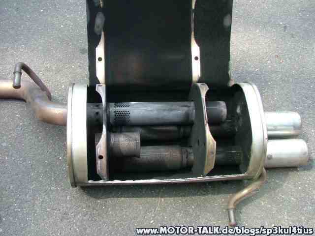 Nee, Scherz bei Seite! Wie bogman schon richtig schreibt, wird hier über ein Prellblech die Schallwellen gebrochen. Diese Art von Enschalldämpfer (ESD) nennt man Reflektionschalldämfer. Dabei wird das Abgas durch mehrere kleine Kammern, die durch Röhren miteinander verbunden sind, geleitet. Dabei wird das Abgas mehrhrfach umgeleitet und die Schallwellen werden reflektiert was zu einer teilweisen Auslöschung dieser führt. Unten im Bild ist so ein Prinzip an einem Autoschalldämpfer zu sehen.