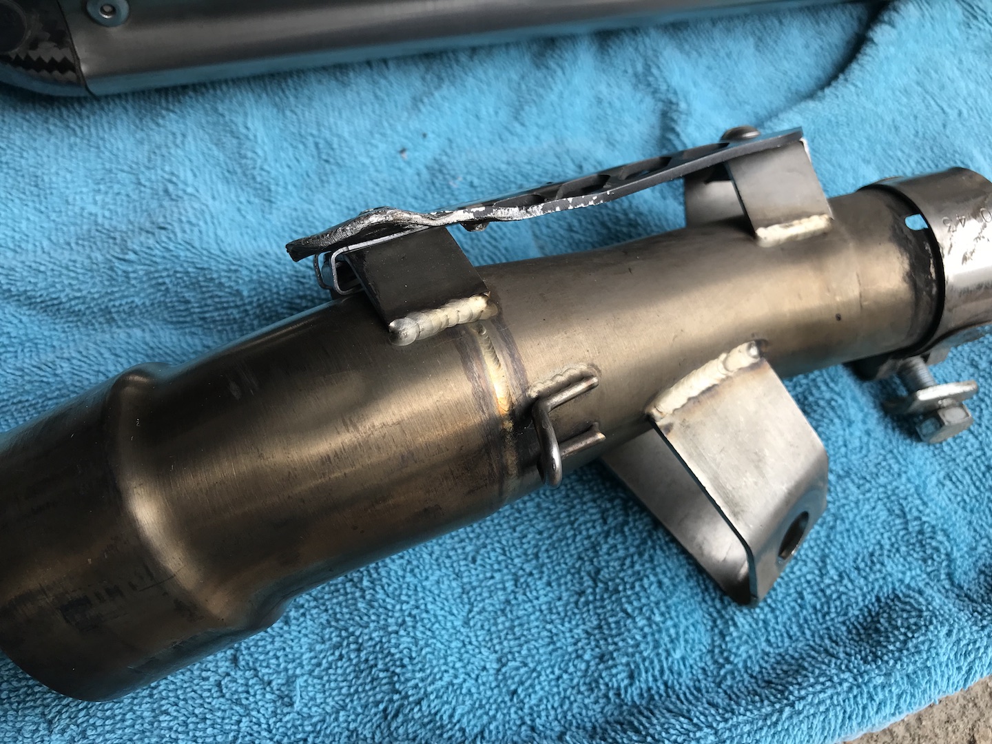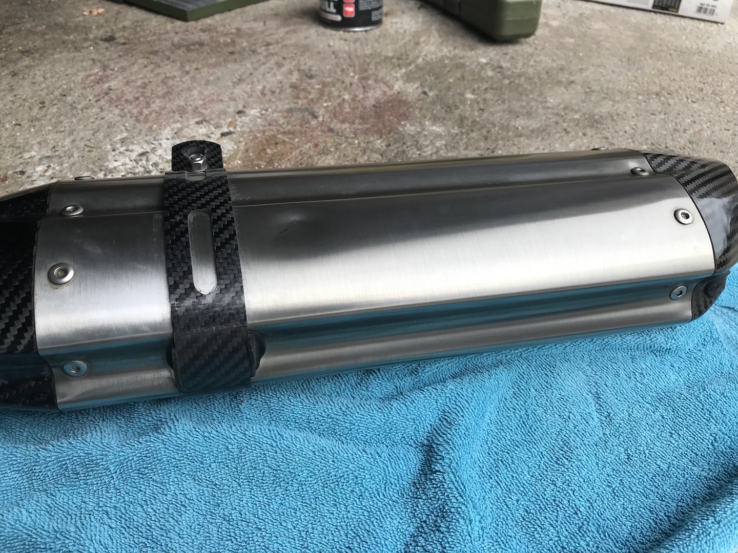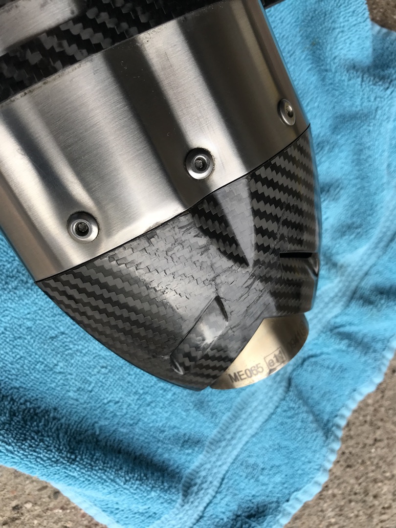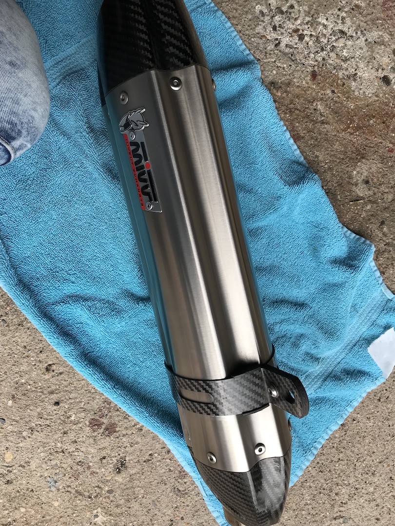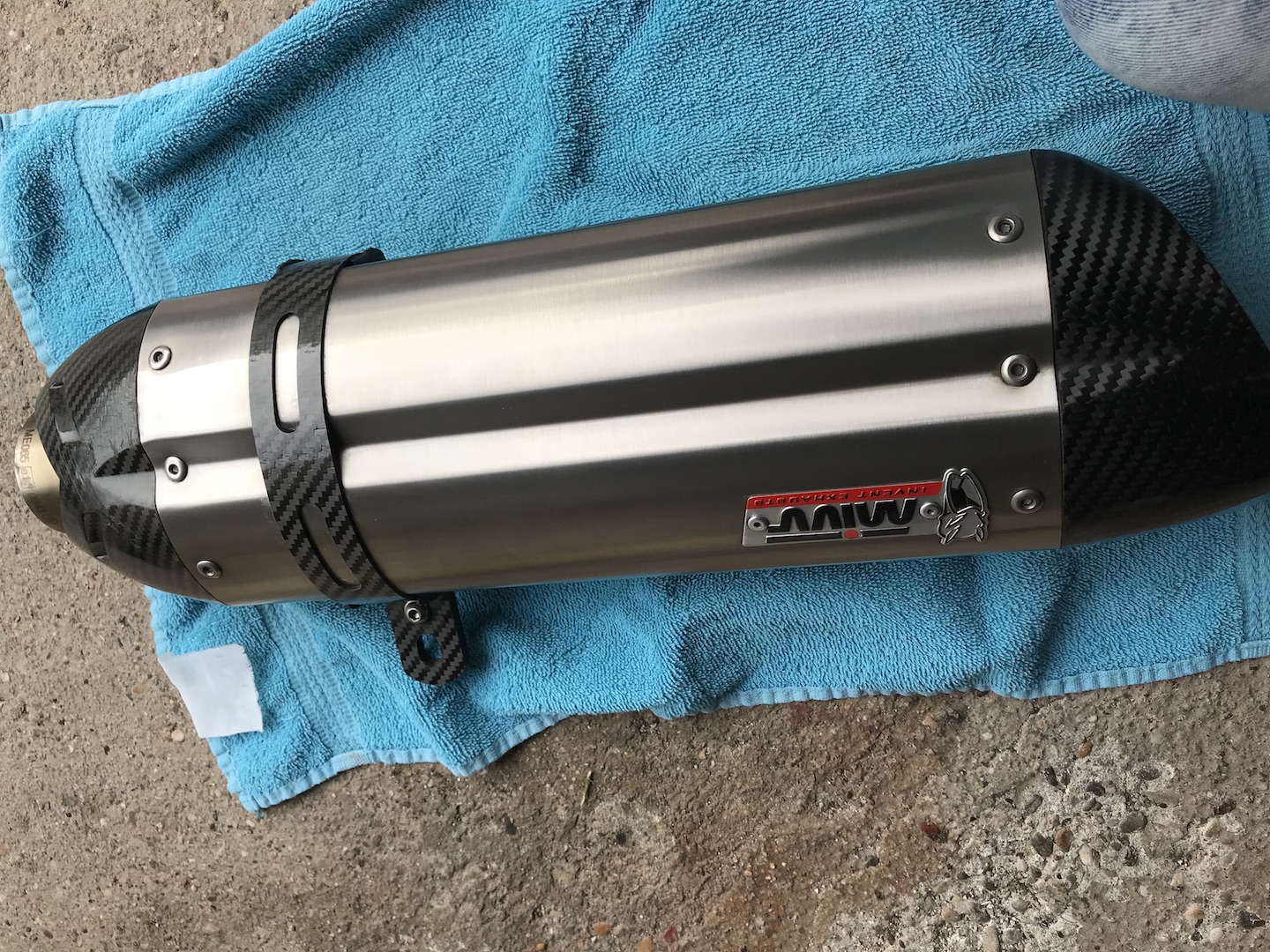 Auspufftopf selbst ist bis auf normale leichte Gebrauchsspuren in gutem Zustand, einzig und allein das Hitzeschutzblech- das am Verbindungsrohr zum Krümmer hin durch 2 Schrauben daran befestigt ist(sollte also problemlos auf Wunsch bei MIVV als Ersatzteil bestellbar sein) ist veredelt und der schwarze Lack ist teilweise abgerieben- Resultat einer leichten "Feindberührung" durch den Kotflügel eines Autos.Man kann es auch einfach komplett abschrauben, allerdings ist dann der Schutz gegen Berührung des Verbindungsrohr nicht mehr vorhanden. Muss der neue Besitzer für sich selbst entscheiden dann....