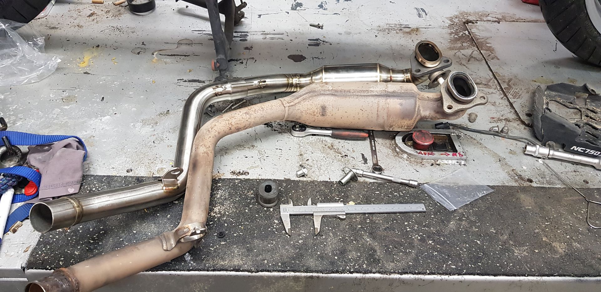 Ein paar kleine Anpassungen musste ich doch noch machen (das vordere Rohr um ca 15mm kürzen, damit die Halterung am hinteren Rohr genau am Befestigungspunkt liegt, und der Masseanschluss, für was auch immer für ein Kabel der an der alten Anlage war, fehlte am neuen Rohr) .