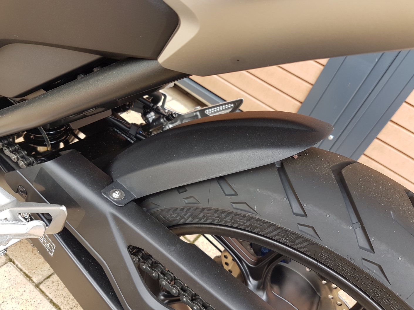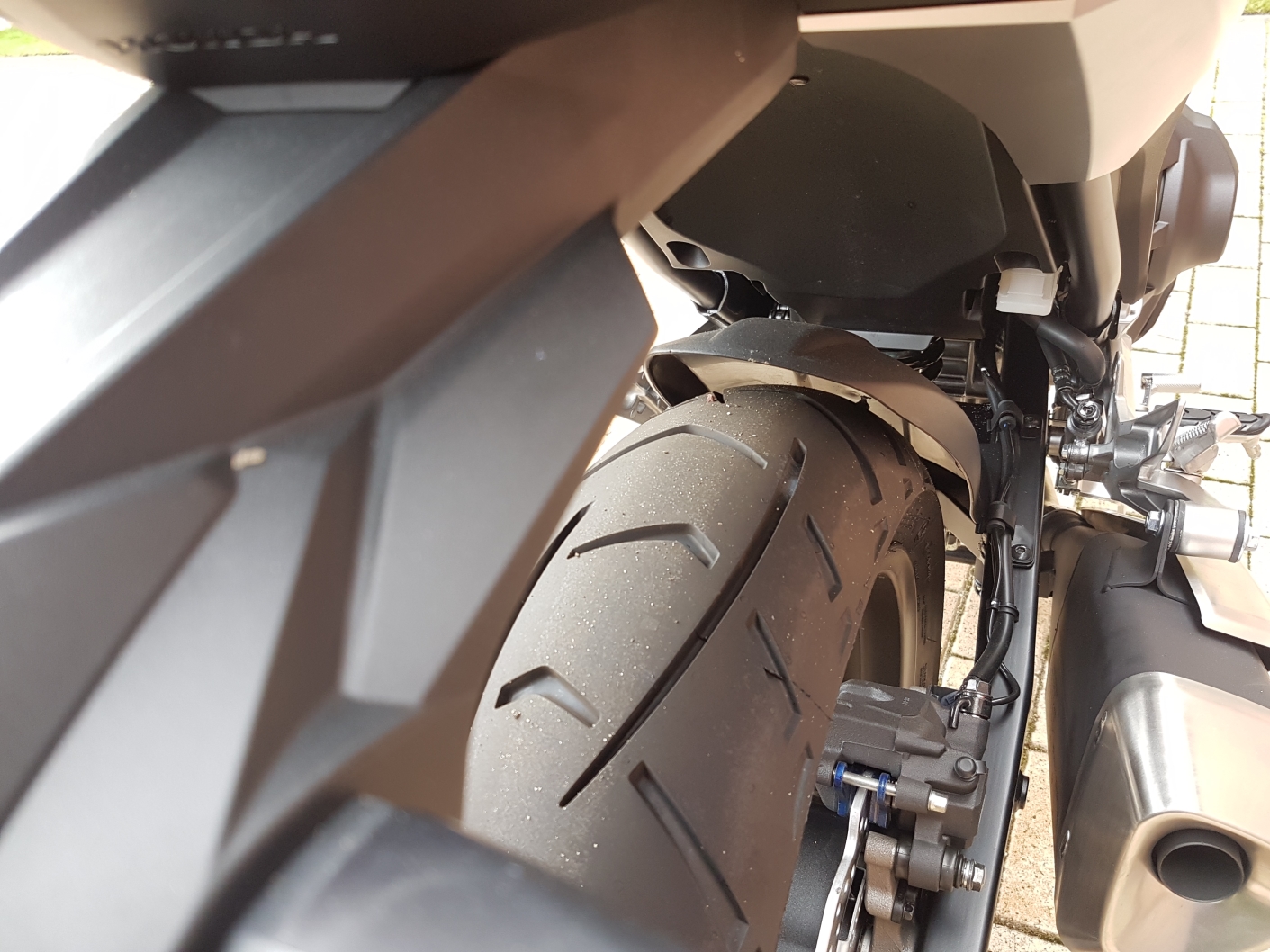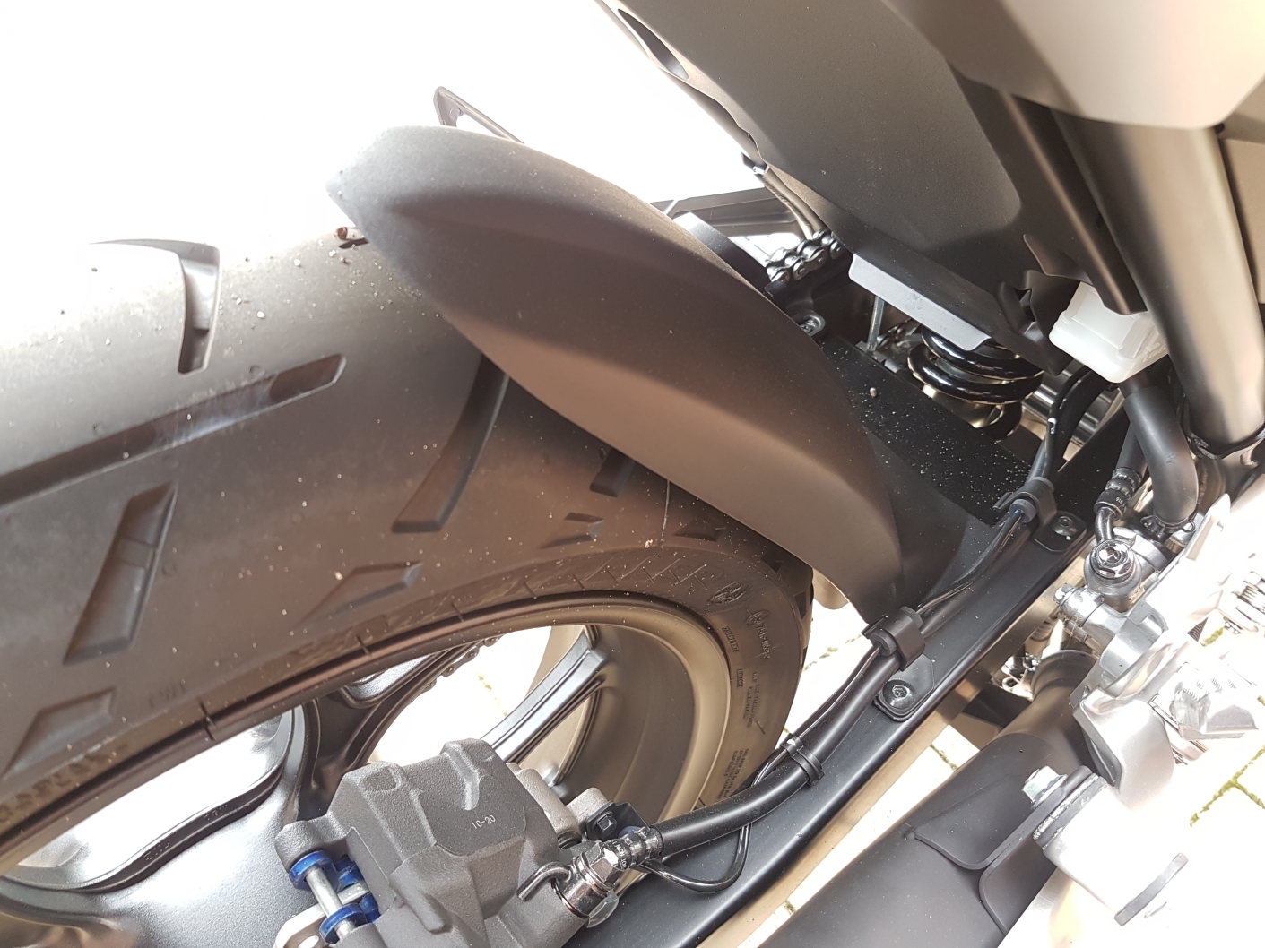 Rechte Seite muss die originale Halterung die in der Schwinge klemmt (mit der auch die beiden Bremsleitungshalter befestigt sind) raus und nur die Halterungen für die Leitungen habe ich wieder mit angeschraubt, über dem Spritzschutz. Es passt nur eines, entweder die Plastikhalterung oder der Spritzschutz.