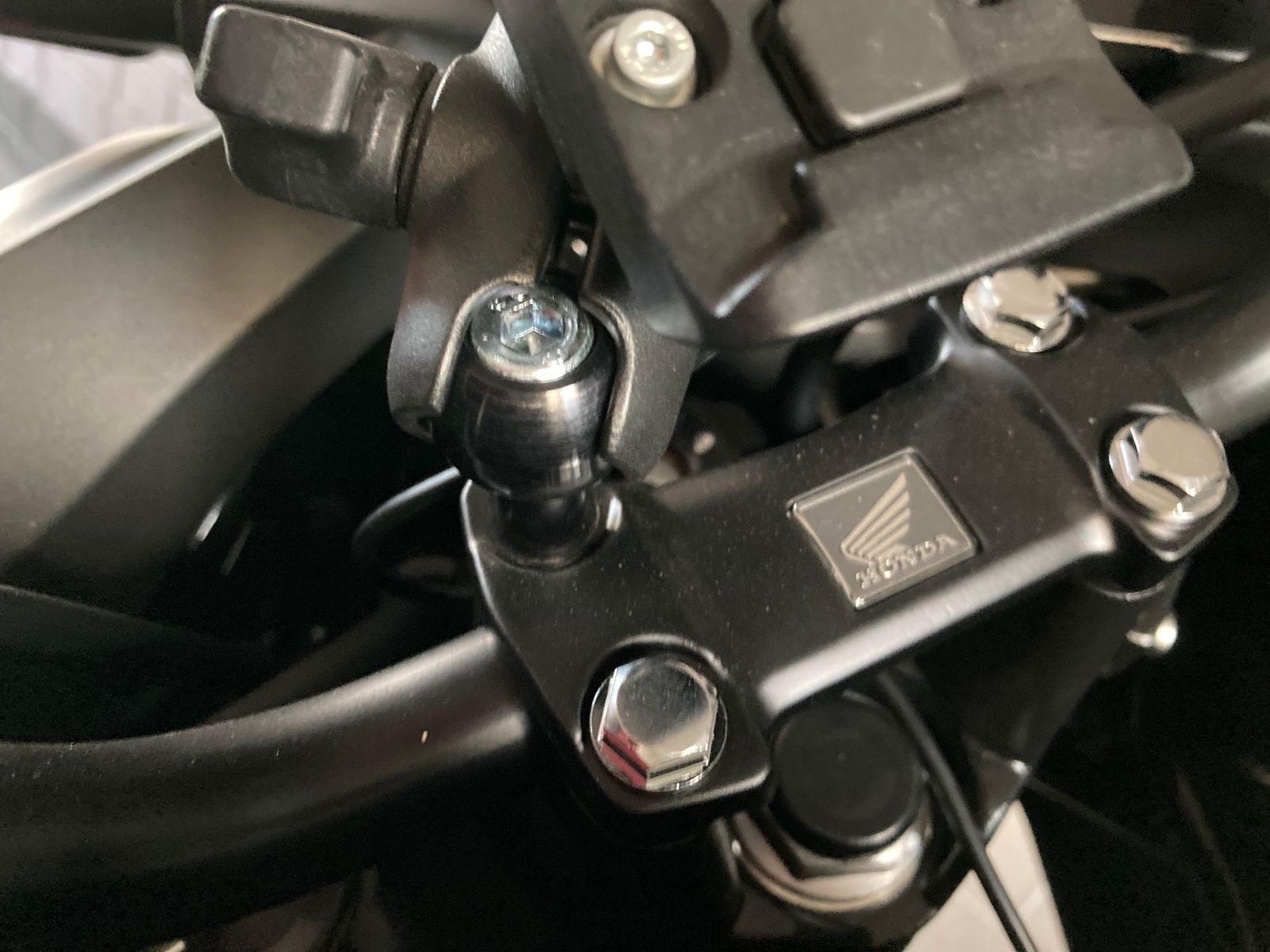 ich habe mir vom Honda-Händler eine 1''-Kugel von SW-Motech am Lenker-Klemmbock anbringen lassen, denn er hatte das richtige Modell bei der Auslieferung meines Mopeds gerade da und dann ging es schneller. Die Kugel (samt entsprechender Schraube) ersetzt eine der vier Schrauben am Klemmbock. Das Navi von Garmin wird dann mit Zubehör von RAM-Mount angebracht...siehe Bilder.