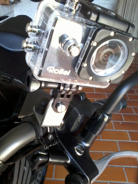 Die Camera im Gehäuse kann mit den beiliegenden Halterungen nicht sinnvoll am Lenker angebracht werden, dafür fehlt ein Drehgelenk