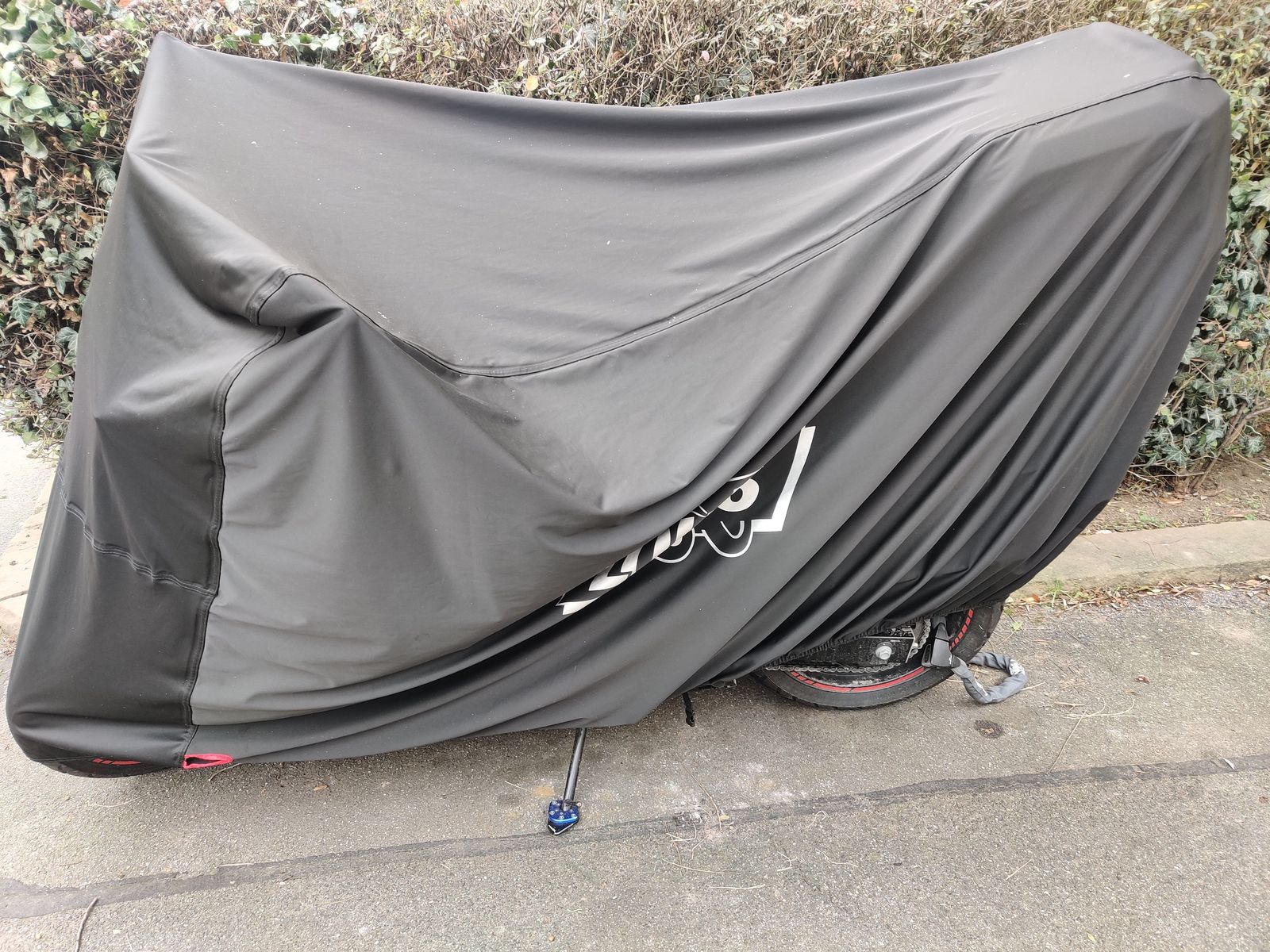 Sie passt mitsamt den klobigen Shad Terra Koffern über das Bike und lässt unten etwas Abstand zum Boden (wichtig, Belüftung).